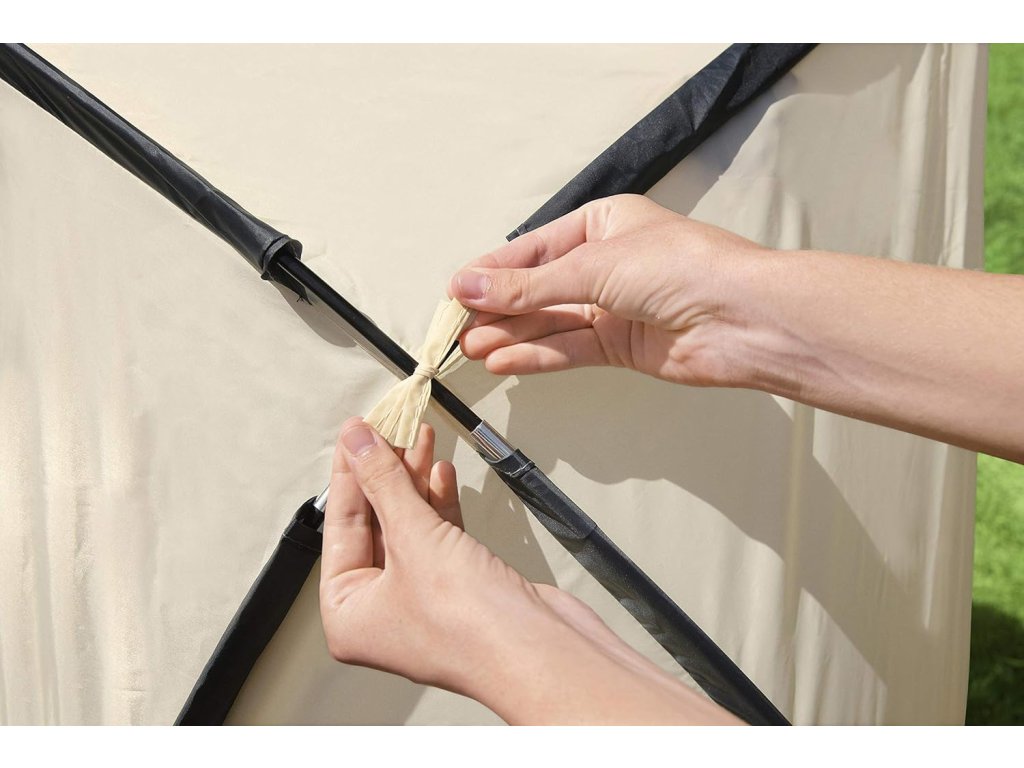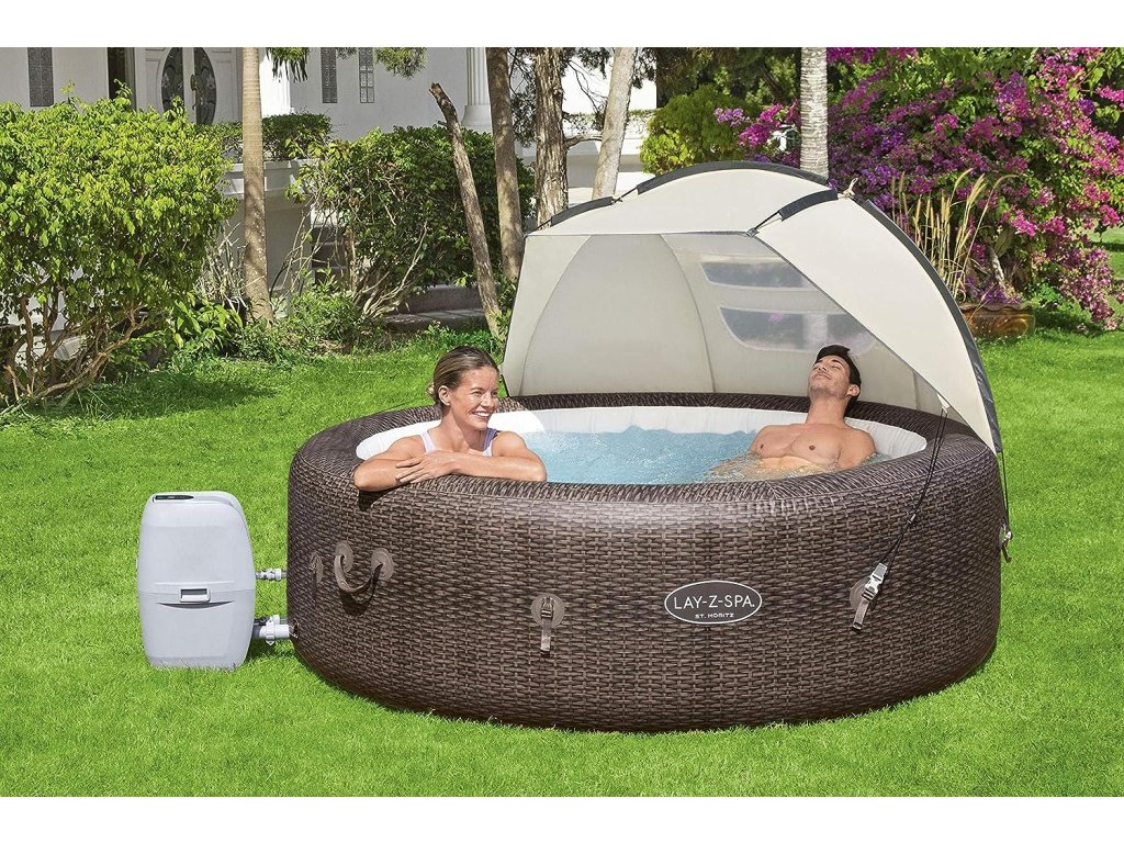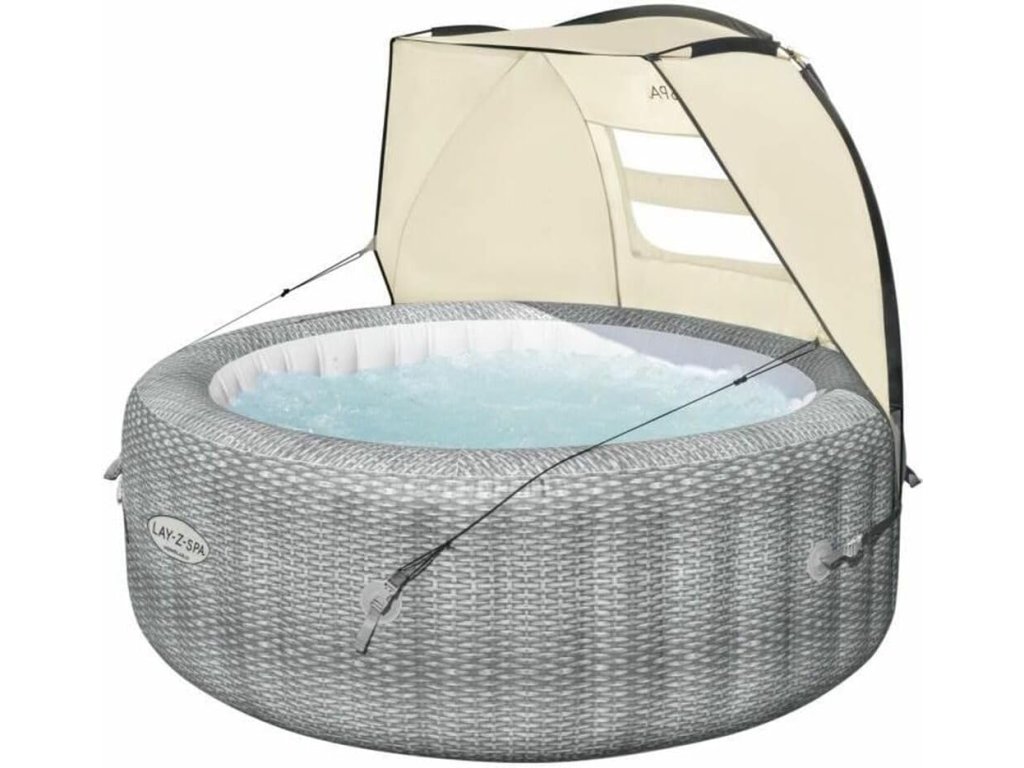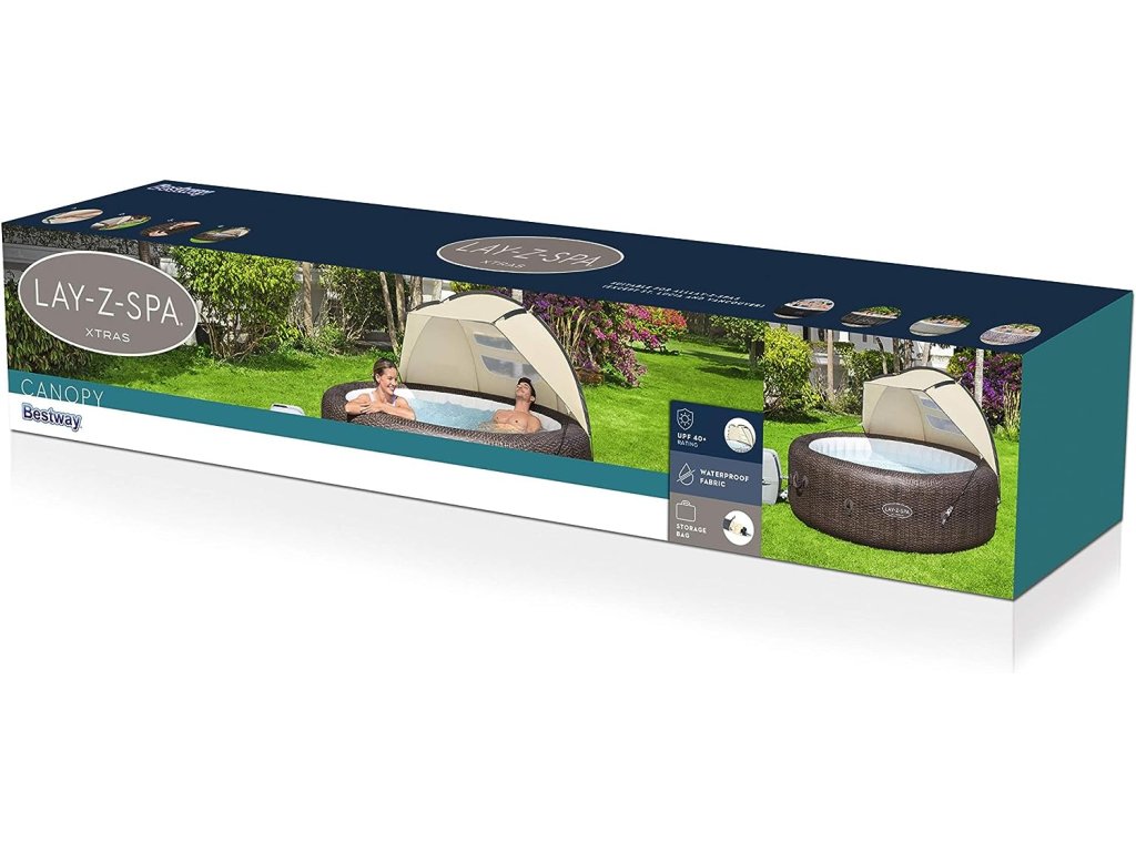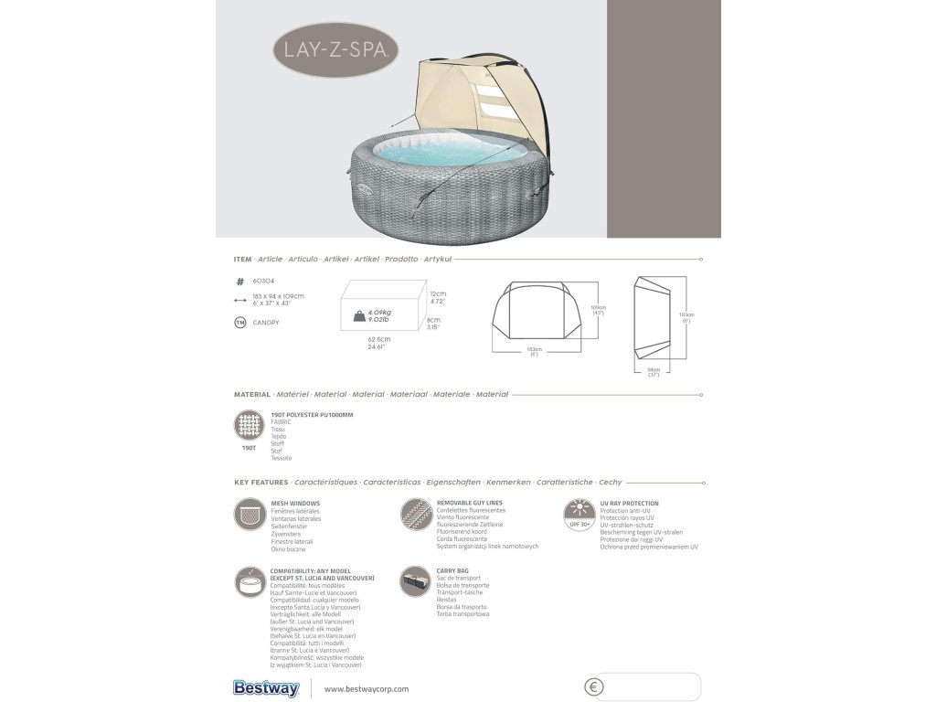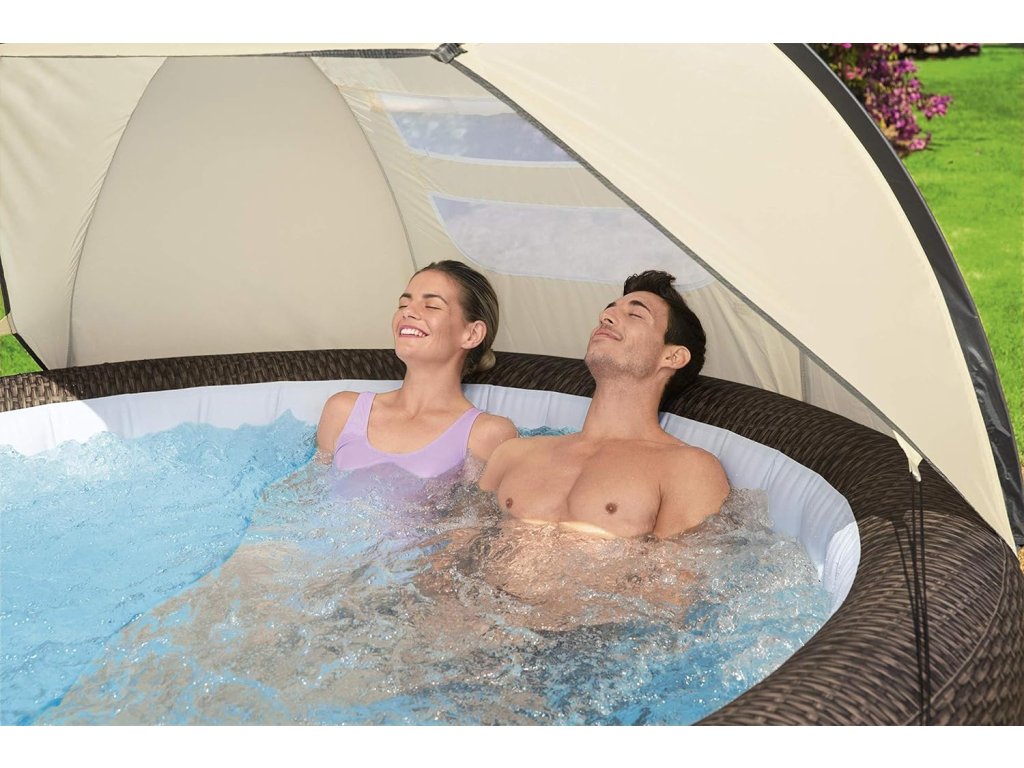 Elegantní a praktická stříška, určená pro kulaté nafukovací vířivky Bestway, poskytuje dokonalou ochranu před sluncem, větrem a deštěm, a zároveň navozuje zvýšený komfort a soukromí při odpočinku venku. Látka je voděodolná, ale po použití doporučujeme nechat uschnout před složením pro delší životnost.
