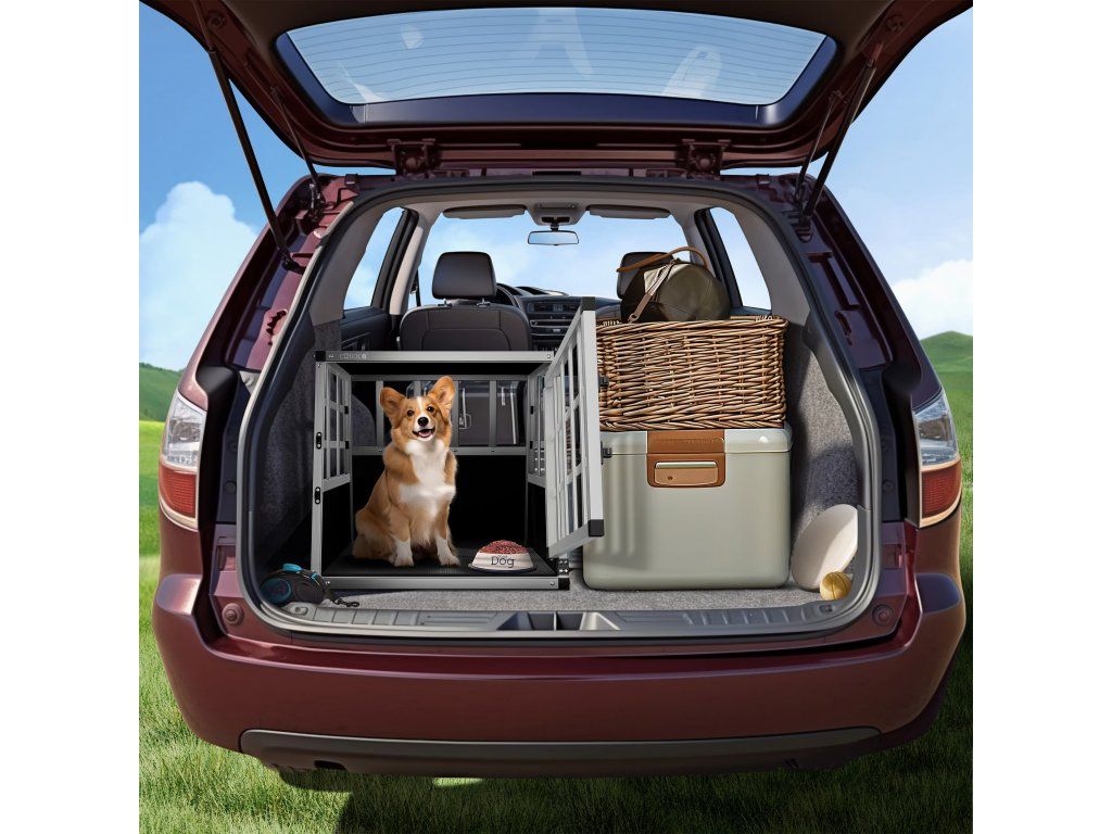 Přepravka je vybavena uzamykatelnými dveřmi, které zajišťují bezpečný transport. Konstrukce je stabilní, lehká a vhodná pro pravidelné cestování autem.