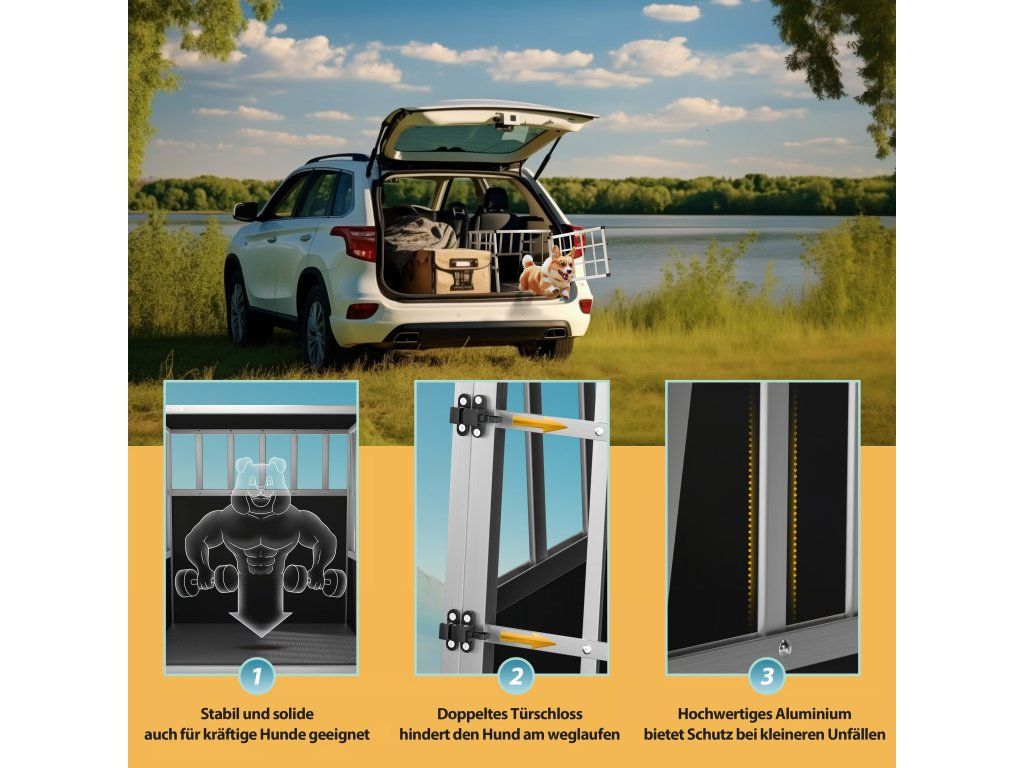 Přepravka je vybavena uzamykatelnými dveřmi, které zajišťují bezpečný transport. Konstrukce je stabilní, lehká a vhodná pro pravidelné cestování autem.