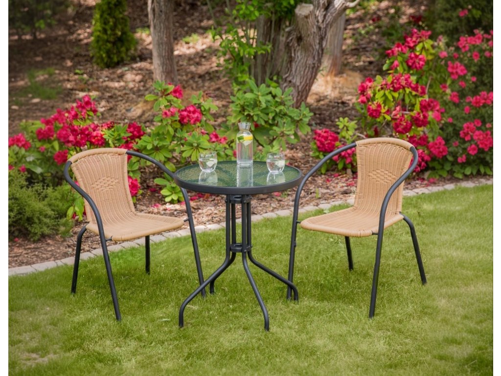 3dílný set kvalitního nábytku z kovové konstrukce a PE ratanu. 2 ks židlí a stůl se skleněnou výplní o průměru 60cm. Židle mají vyztužení pro lepší stabilitu a pevnost.