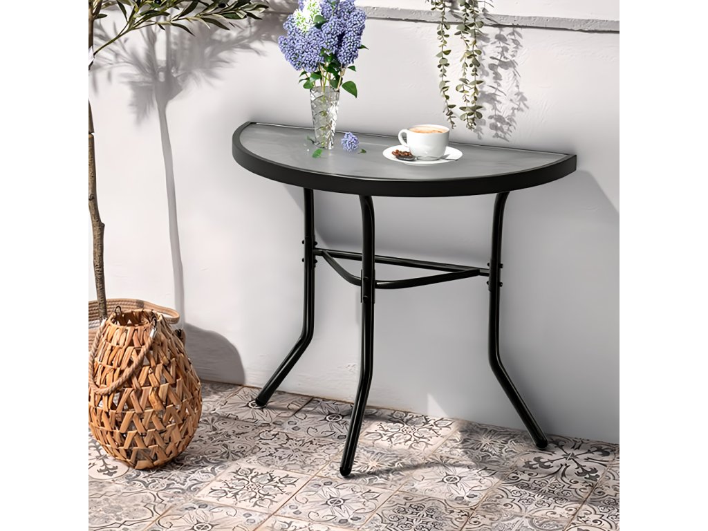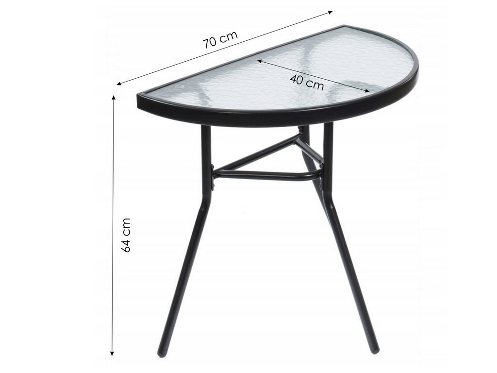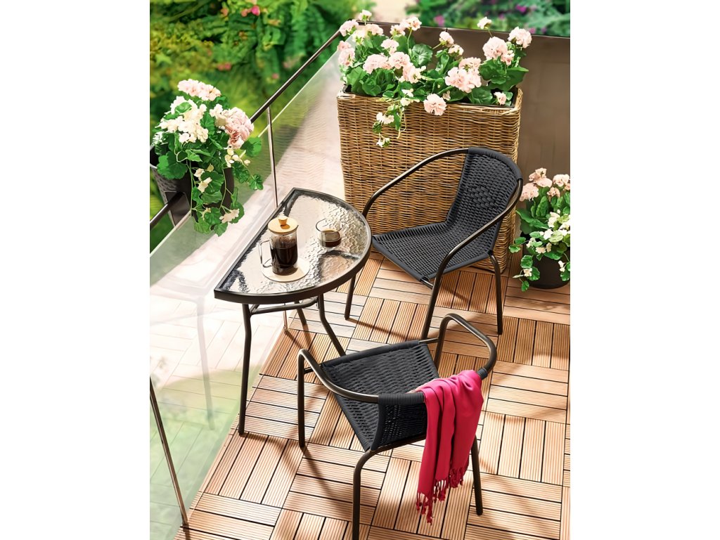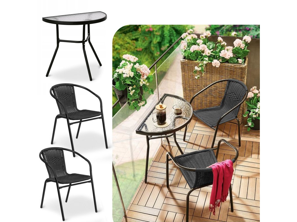 3dílný set kvalitního nábytku z kovové konstrukce a PE ratanu. 2 ks židlí a půlkulatý stůl se skleněnou výplní. Židle mají vyztužení pro lepší stabilitu a pevnost.