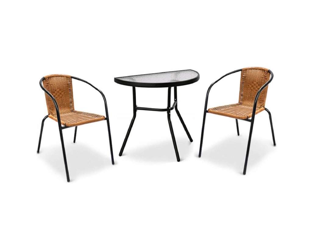 3dílný set kvalitního nábytku z kovové konstrukce a PE ratanu. 2 ks židlí a půlkulatý stůl se skleněnou výplní. Židle mají vyztužení pro lepší stabilitu a pevnost.