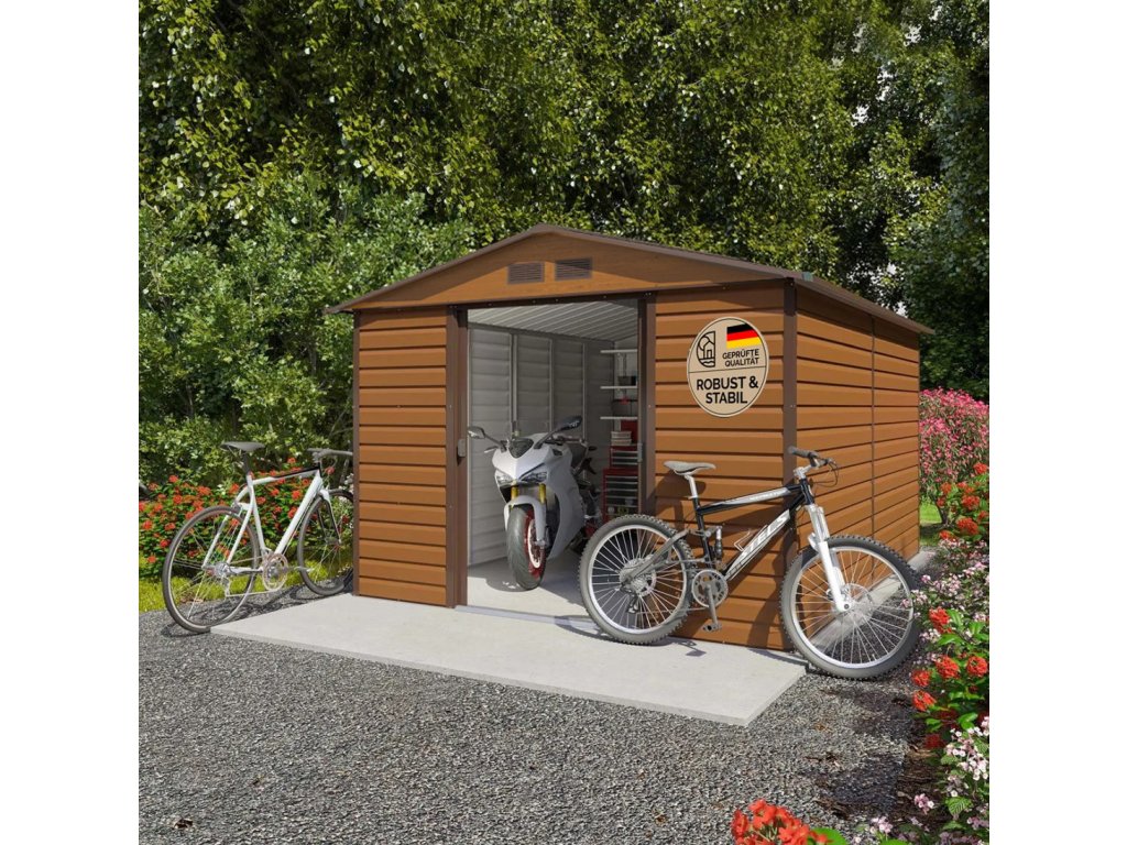 Zahradní domek značky Crossheim v odstínu ořech nabízí dostatek místa pro kola, nářadí a veškeré zahradní vybavení, má posuvné dveře, větrací otvory a je dodáván s podlahovou lištou. Zahradní domek je ideální pro celoroční uskladnění zahradního nářadí popřípadě jiného vybavení.