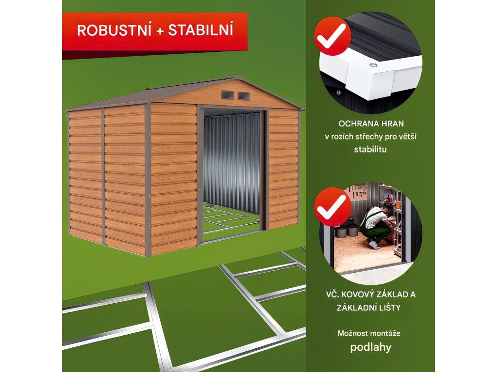 - Ocelová konstrukce: Pevná nosná konstrukce je vyrobena ze silnějších ocelových profilů (0,6 mm).