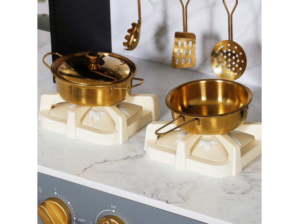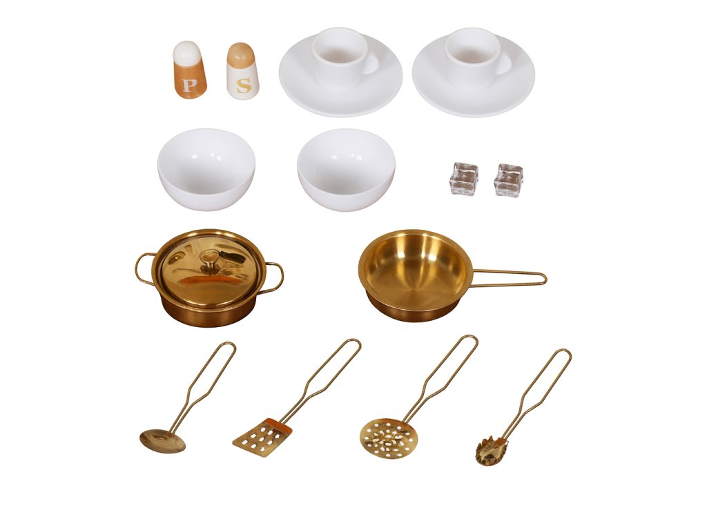 - Stylové příslušenství - součástí kuchyňky jsou barevně sladěné (zlaté) doplňky v podobě hrnce s pokličkou, pánve, různých naběraček a obraceček. Nechybí ani šálky na kávu, misky, kostky ledu a koření.