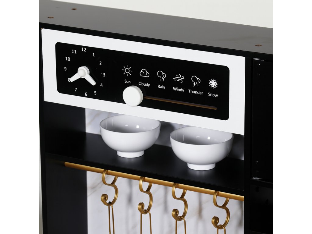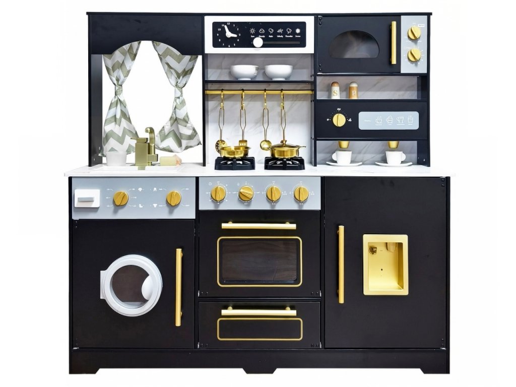 - Černá barva, zlaté úchyty, doplňky a detaily dodávají dětské kuchyňce styl.