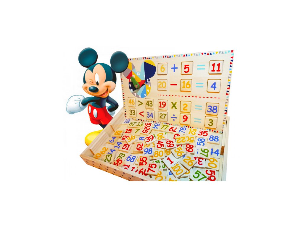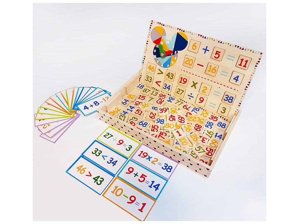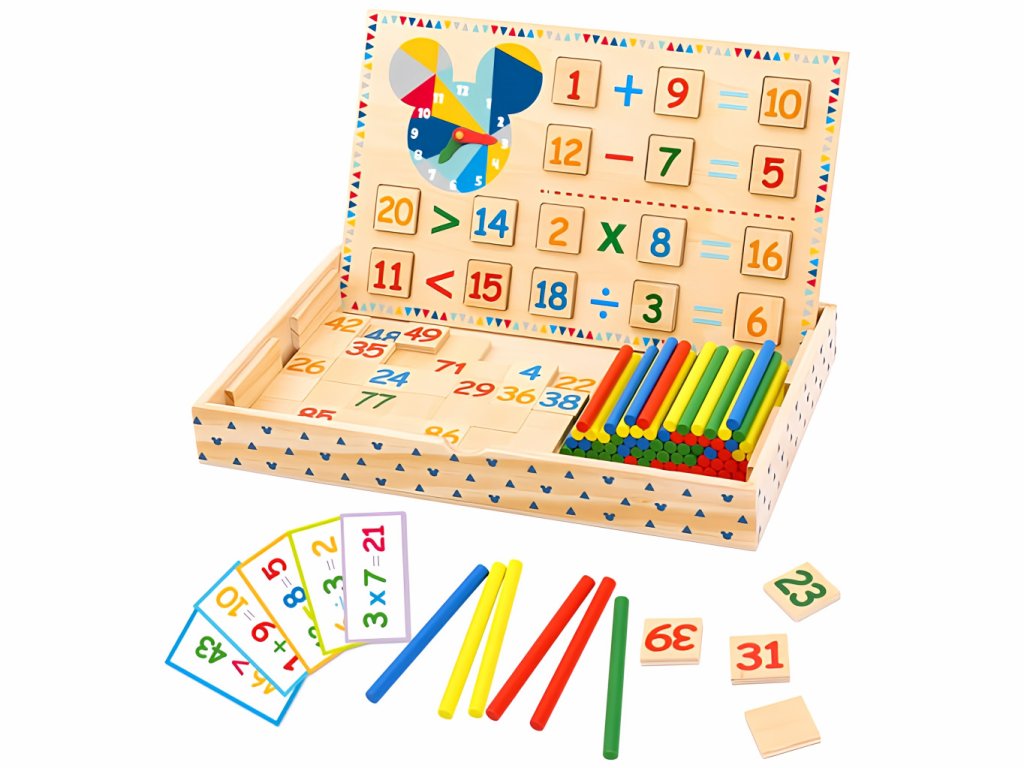 Dřevěná edukativní hračka v podobě velké sady počítání. Díky tomuto propracovanému setu se seznámí předškoláci se základy jednoduchého počítání - menší, větší, sčítání, odčítání. Pro školáky jsou potom k dispozici složitější příklady - násobení a dělení. Díky bohatému příslušenství si mohou děti pomáhat různými způsoby. Tyčkami mohou spočítat jednoduché příklady, případně lze tyčky rozdělit dle barev. Pomocí oboustranných kartiček mohou děti řešit konkrétní příklady a pomůckami si pomáhat s řešením výsledků. Ideální vzdělávací pomocník pro domácí úkoly, do škol nebo mateřských škol. Díky praktickému balení si lze vzít kufřík kdykoliv sebou, i na cesty.