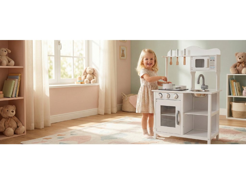 Pořiďte své malé kuchařce či kuchaři tuto krásnou dřevěnou kuchyňku v moderním bílém provedení. Kuchyňka je plně vybavená - její součástí je interaktivní sporák s troubou, dřez, vestavěná mikrovlnná trouba i kuchyňské náčiní. Součástí je hrnec a pánev s pokličkou, nůž, vařečka a vidlička.