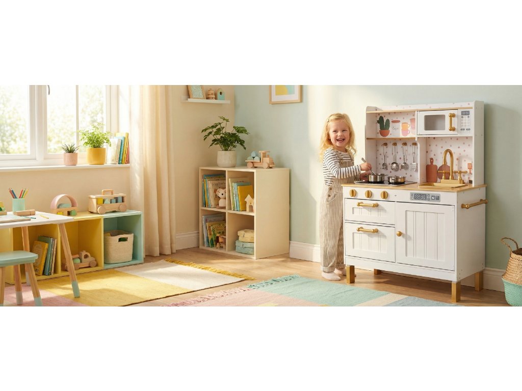 Pořiďte své malé kuchařce či kuchaři tuto krásnou dřevěnou kuchyňku v moderním provedení. Její součástí je interaktivní sporák, dřez s vodovodní baterií, mikrovlnná trouba a 7 ks příslušenství.