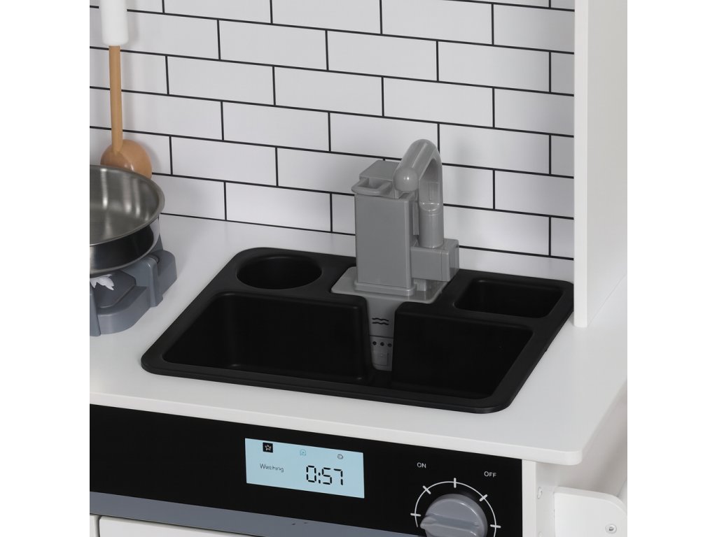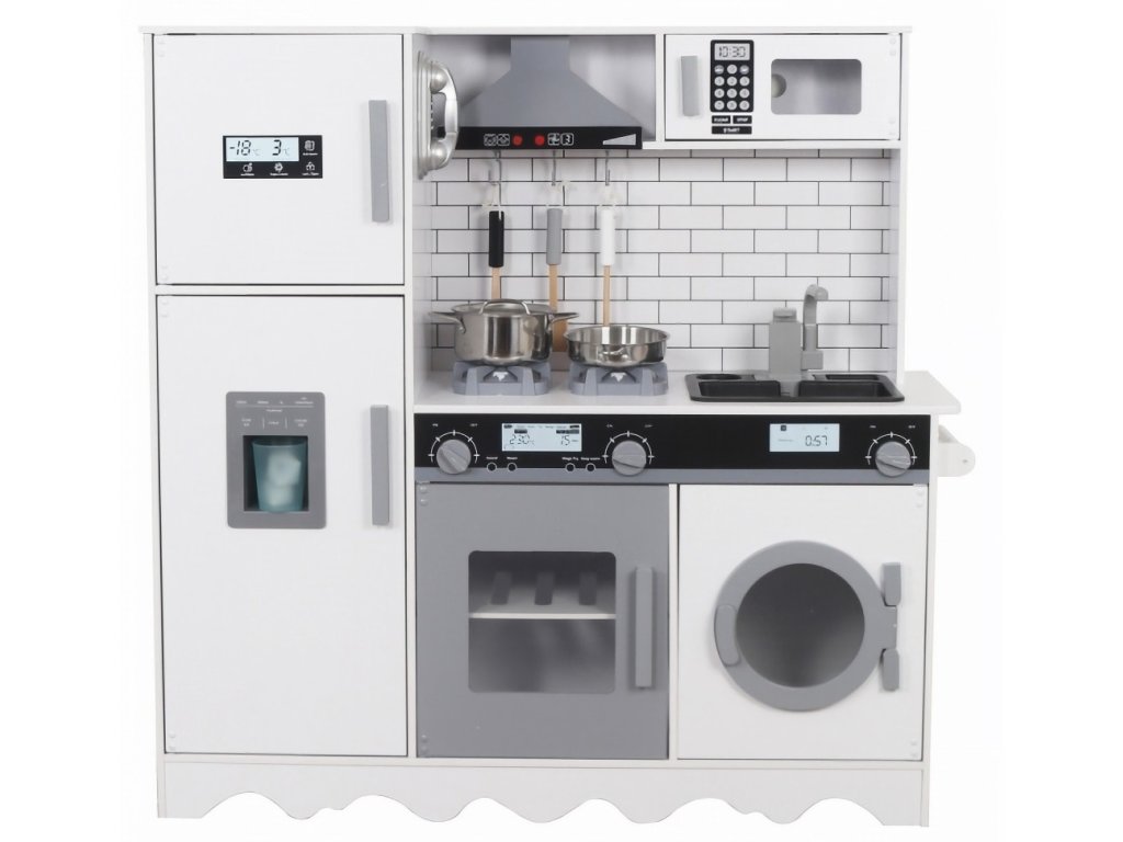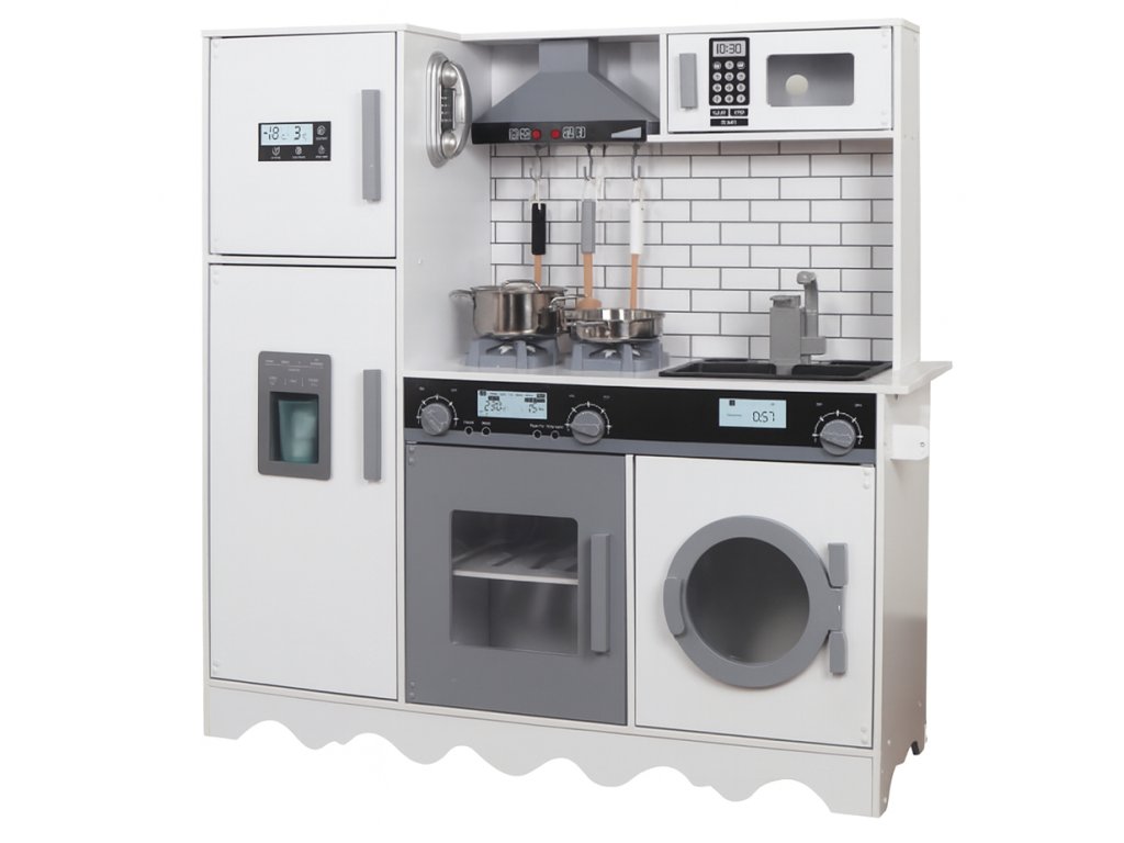 Tato moderní dřevěná kuchyňka v bílo-šedé barevné kombinaci je vybavena bohatým příslušenstvím a množstvím interaktivních prvků, které dětem poskytnou nezapomenutelný zážitek ze hry.