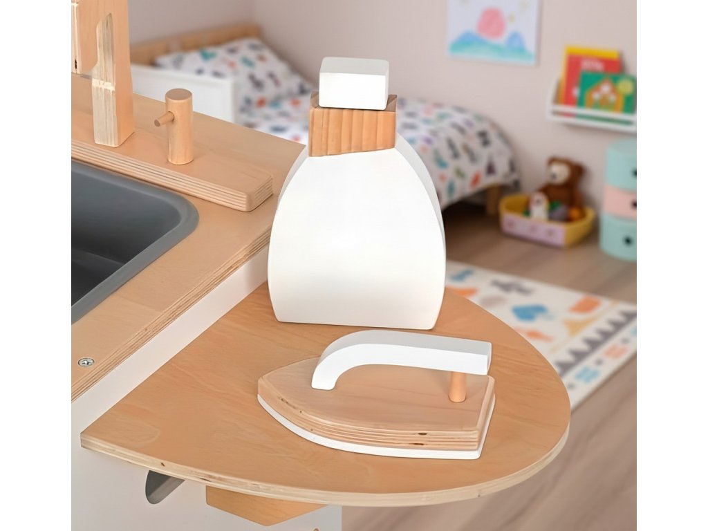 Ve výbavě najdete také tři police, z nichž jedna slouží jako žehlicí prkno – ideální na oblečení panenek. Nad ovládacími knoflíky je navíc umístěn výsuvný dřez s kohoutkem.