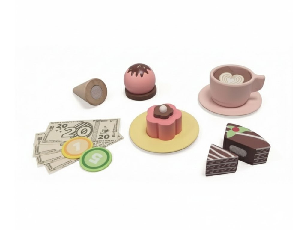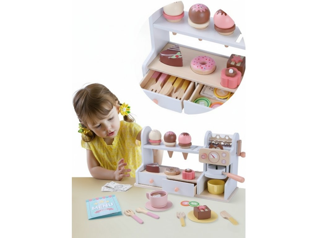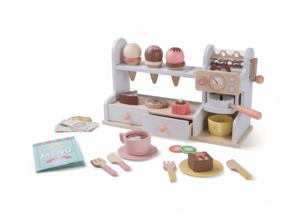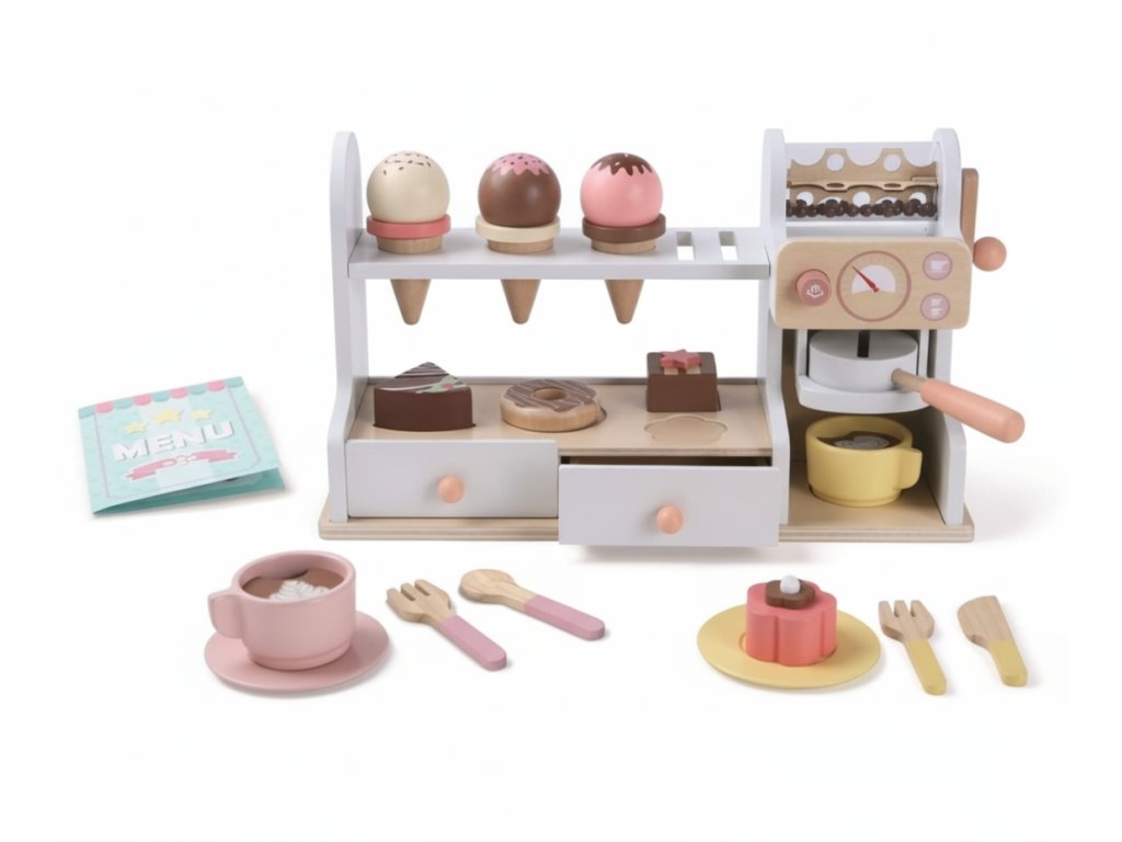 Herní sada obsahuje kavárnu s dřevěným kávovarem a spoustou lákavých doplňků – zmrzlinu, dorty, hrnky na kávu, příbory a další, vše vyrobené z masivního dřeva.