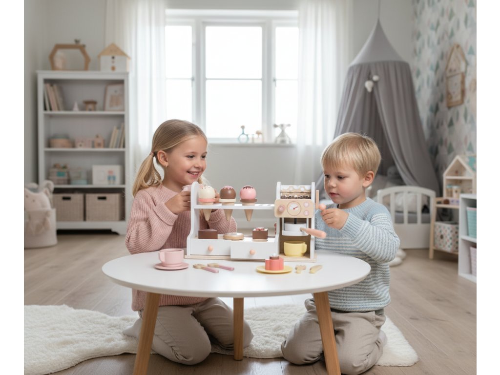 Je libo zmrzlinu, dortík nebo jen lahodnou kávu? S touto 46-dílnou sadou si užijete hodiny zábavy. Sada nabízí šálky s podšálky, příbory a lžíce, pultík s kávovarem, vitrínou s dortíky a poličkou s díry na zmrzliny. Nechybí ani zásuvky s úložným prostorem pro peníze, které jsou také součástí této sady. Hračky na hraní rolí popouštějí v dětech fantazii a inspirují ke kreativní hře, což má příznivý dopad i na jejich slovní zásobu a rozvoj jazyka.