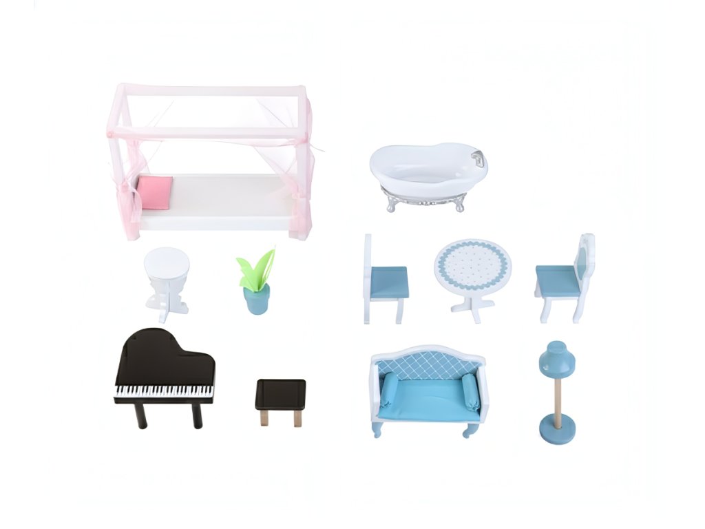 Exteriér domečku nabízí pohled, který je třeba spatřit. Má nádhernou a lákavou fasádu. Hlavní obytnou část, kterou přivítá prostorný a krásný interiér, lze zařídit nábytkem, což umožňuje dětem vytvořit si vlastní útulný obývací pokoj, jídelní kout nebo prostor na hraní pro své panenky. Je tu spousta prostoru pro kreativní vyprávění příběhů a hraní rolí. Dobře vybavená ložnice a koupelna poskytují dokonalé prostředí pro předstírané hry. Všechna podlaží nabízejí další místnosti k prozkoumání.