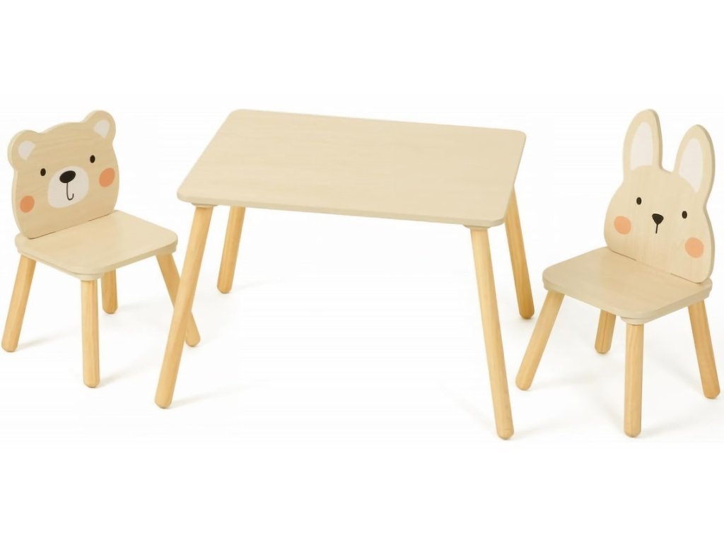 SET STŮL A ŽIDLE: Tato sada obsahuje stůl a 2 židle s motivem králíka a medvěda. Roztomilý styl se hodí do dětských pokojů, heren, školek, tříd.