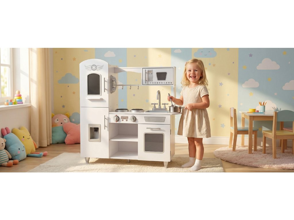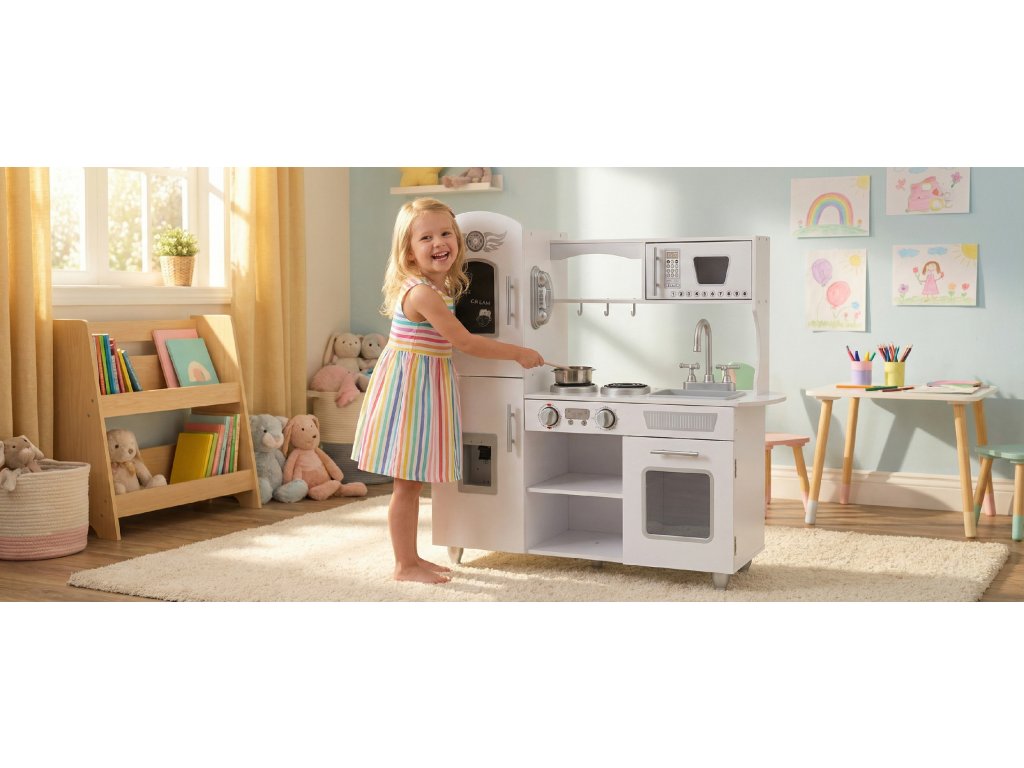 Pořiďte své malé kuchařce či kuchaři tuto krásnou dřevěnou kuchyňku v moderním provedení. Její součástí je sporák s troubou, dřez, vestavěná mikrovlnná trouba, kreslící tabule na poznámky a interaktivní dávkovač ledu.