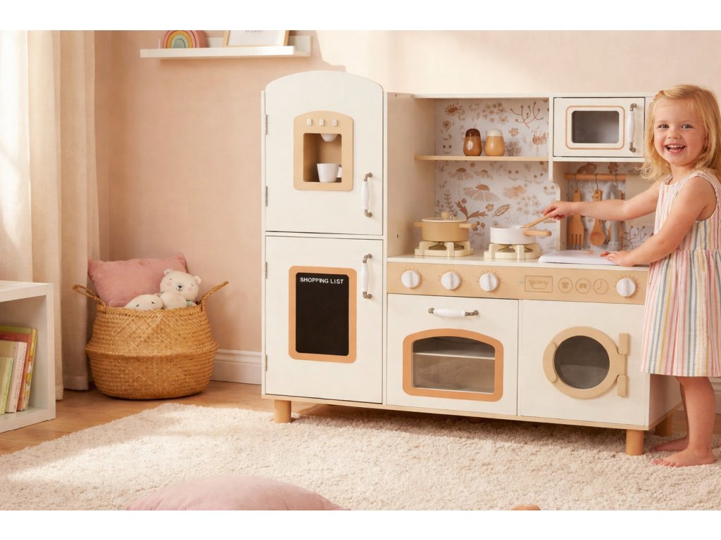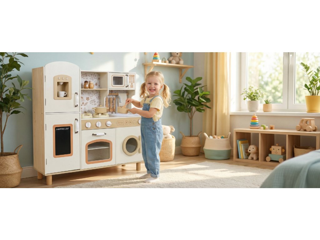 - Edukativní hračka – děti si bezpečnou formou vyzkouší vaření, pečení, umývání nádobí, servírování, praní prádla či přípravu kávy.