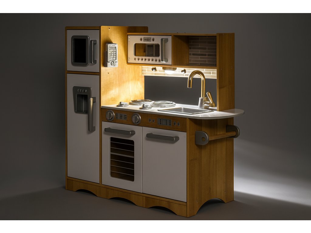 Pořiďte své malé kuchařce či kuchaři tuto krásnou dřevěnou kuchyňku značky Derrson v moderním provedení. Dřevěná kuchyňka je nově vybavená interaktivními hořáky, které vydávají světla a zvuky. Její součástí je sporák s troubou, dřez, vestavěná mikrovlnná trouba, kreslící tabule na poznámky, dávkovač ledu, LED osvětlení a zástěra vhodná pro kluky i holky.