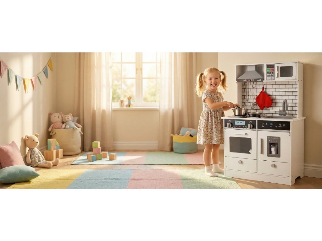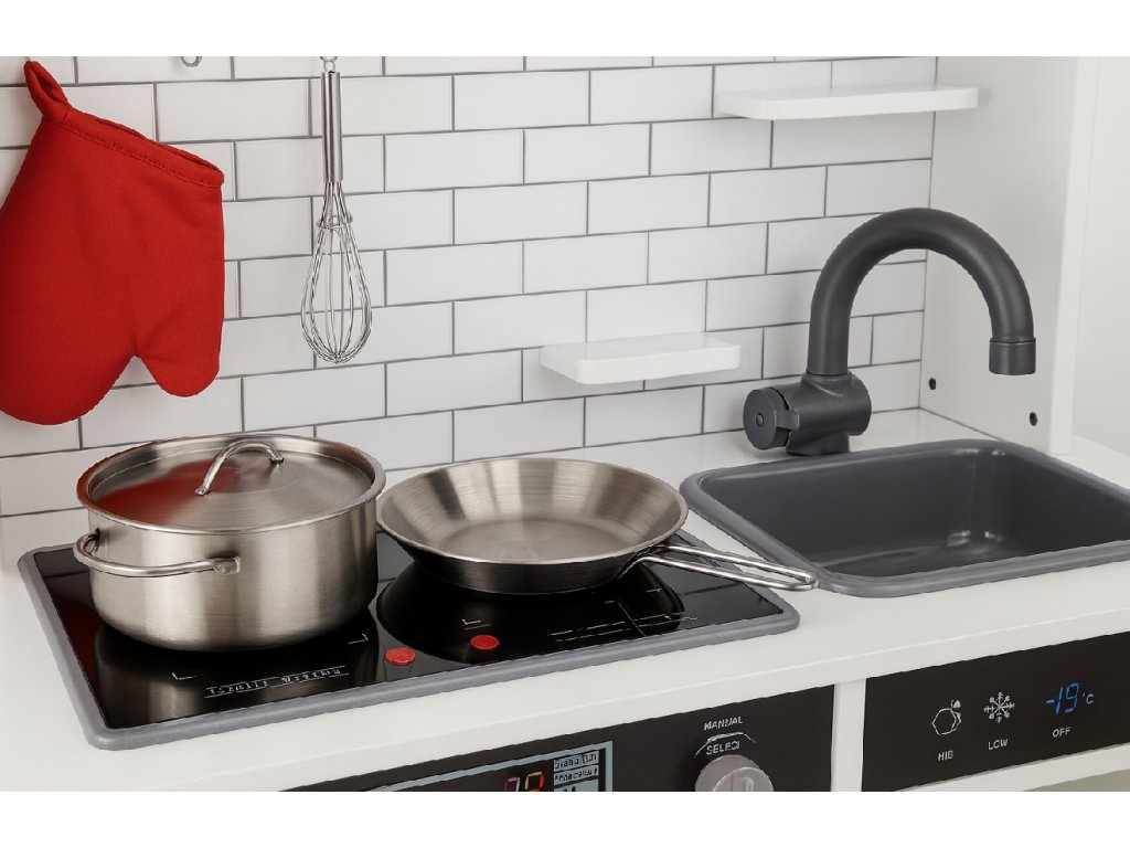 Vyrobeno s důrazem na nejmenší detaily. Pojďme si uvařit a trochu se pobavit s touto krásnou kuchyňkou! Příprava lahodného oběda pro velkou rodinku může právě začít. Kuchyňka v bílém provedení pro kluky i holky.