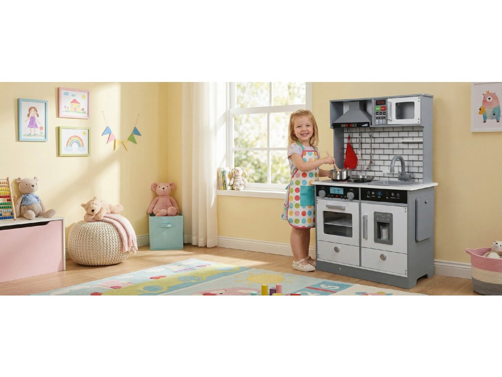 Hračka Derrson XL dřevěná kuchyňka se světly a zvuky šedá W5184 splňuje všechny normy EU.