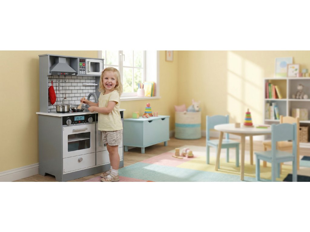 Vyrobeno s důrazem na nejmenší detaily. Pojďme si uvařit a trochu se pobavit s touto krásnou kuchyňkou! Příprava lahodného oběda pro velkou rodinku může právě začít. Kuchyňka v bílo-šedém provedení pro kluky i holky.