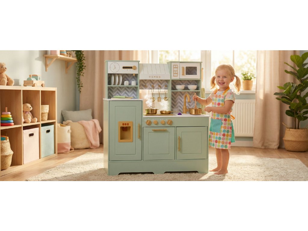 - Dětská dřevěná kuchyňka v zelené barvě nabízí realistické funkce, které podporují kreativitu a rozvoj dovedností. Děti mohou péct, vařit, smažit a umývat nádobí pod skutečnou vodou.