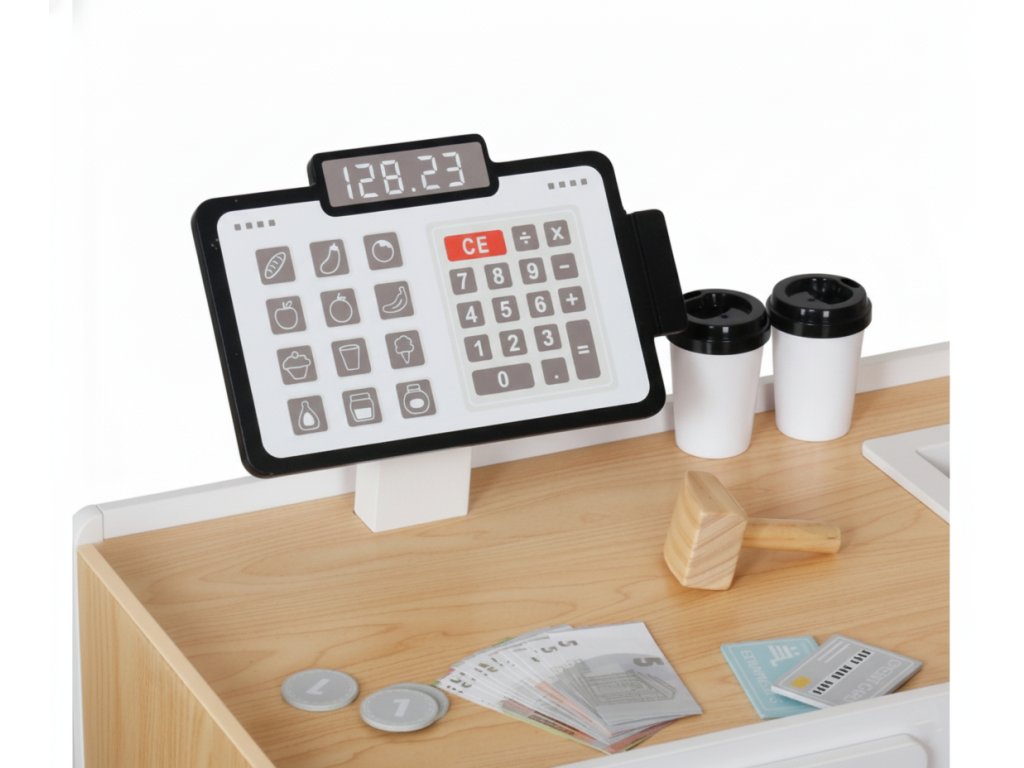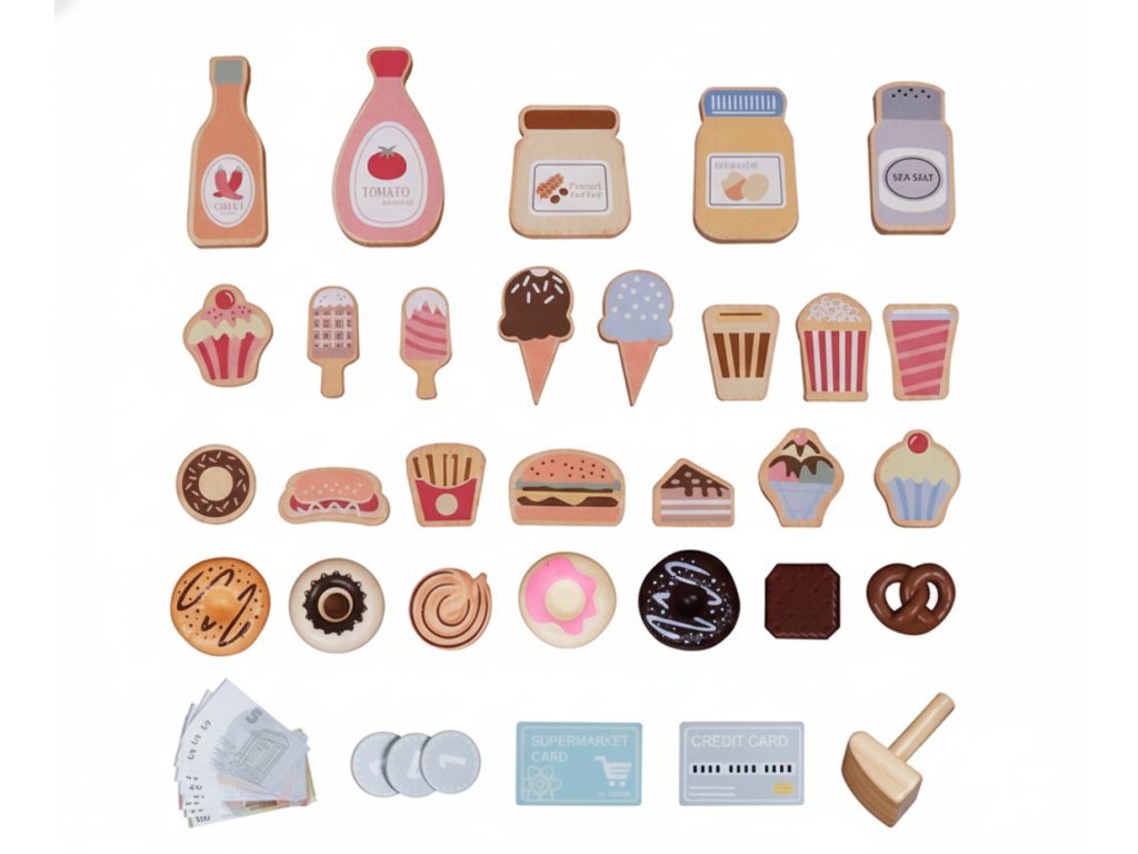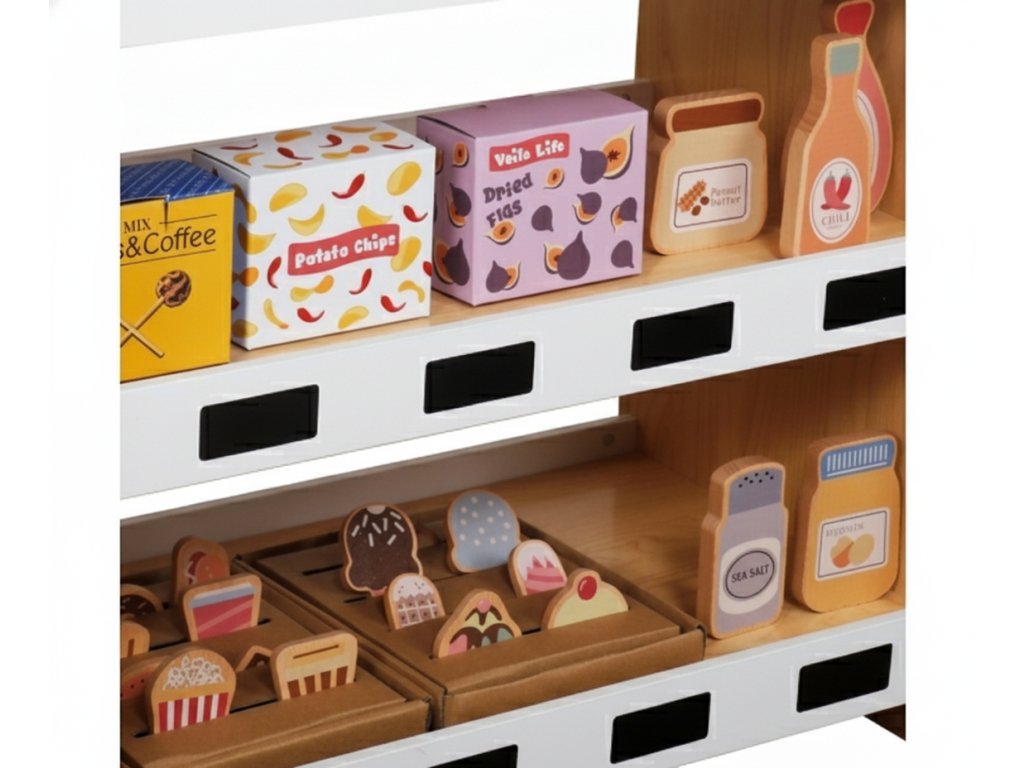 Množství polic pro vystavení zboží umožňují malému prodavači třídit výrobky a pohodlně je uspořádat. Díky stabilnímu stojanu a bohatému vybavení dřevěného stánku se vaše dítě může vžít do role prodavače nebo zákazníka a zajistit si jedinečnou, kreativní zábavu. Sada obsahuje obrovské množství příslušenství, které zaručí zábavu na hodně dlouho.