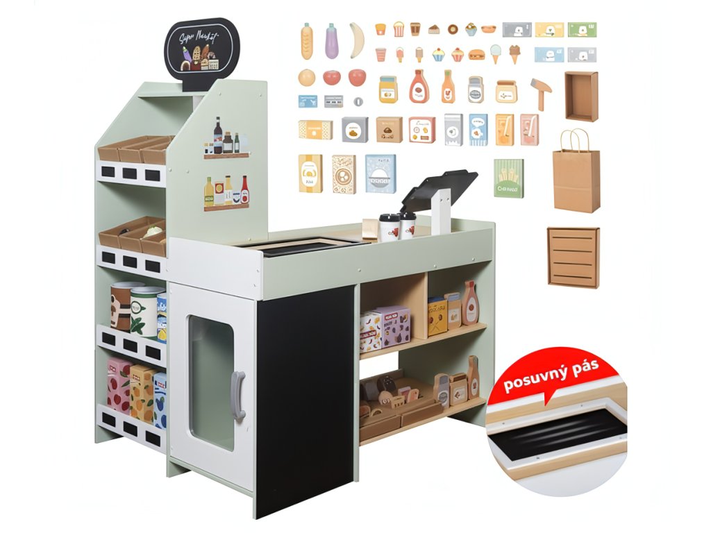 Hra na obchodní stánek je zdrojem mnoha zábavy pro děti téměř všech věkových kategorií! Tento propracovaný dětský obchod obsahuje mechanický posuvný pás, se kterým bude ještě větší zábava!