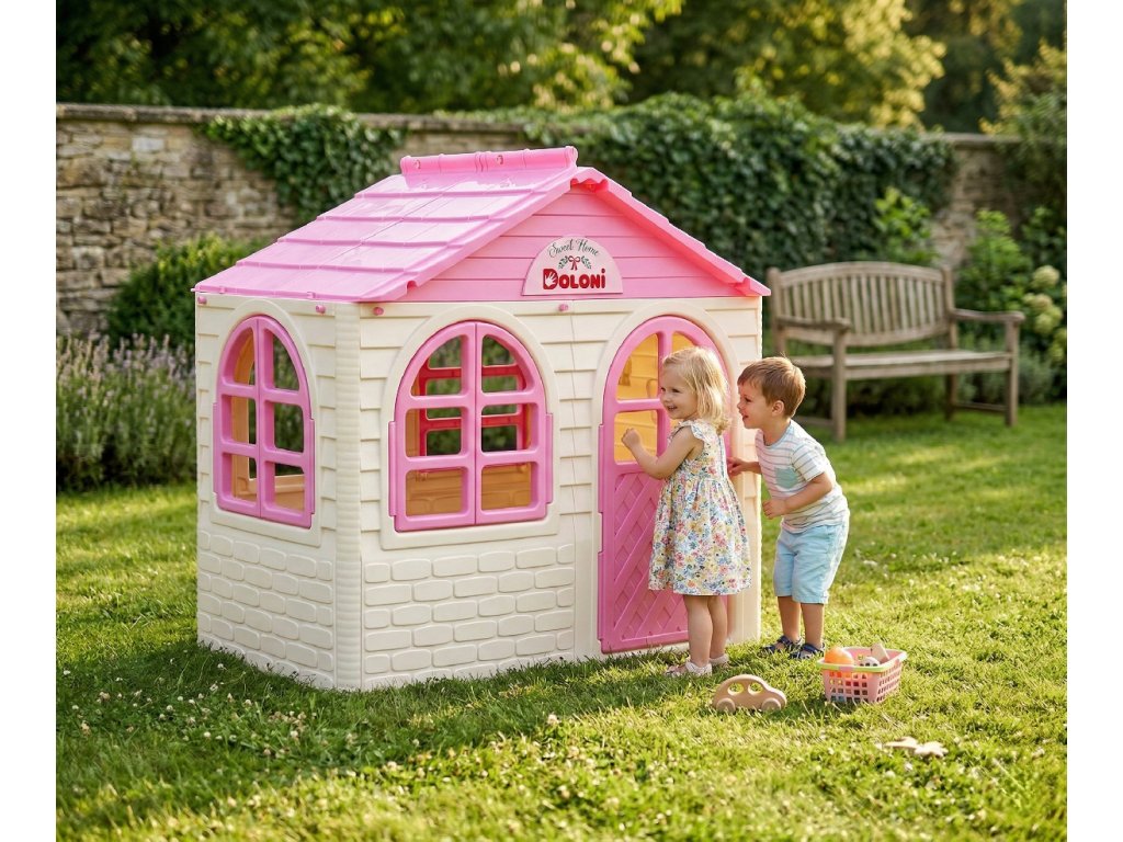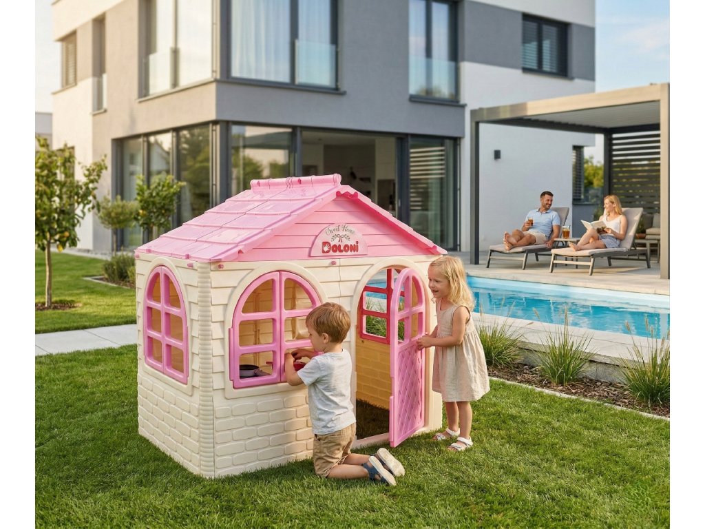 Doloni Dětský zahradní domeček šedo-bílo-růžový splňuje všechny normy EU.