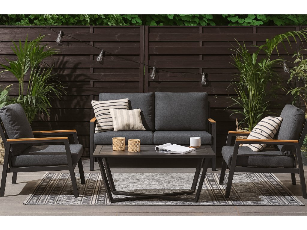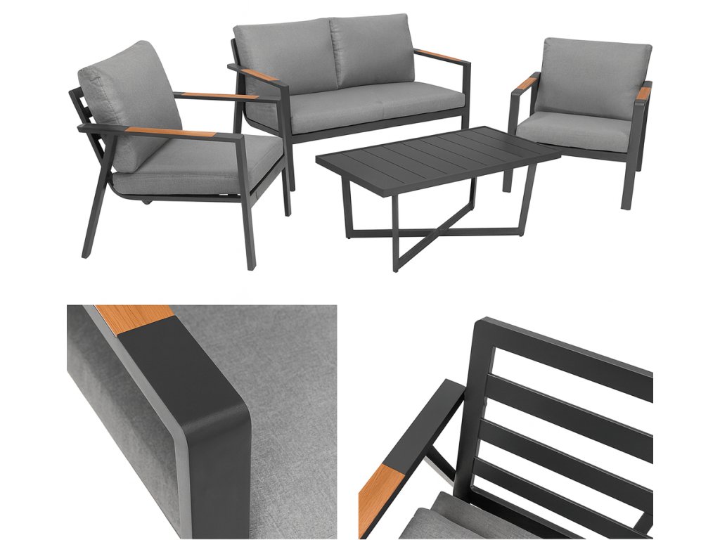 Hliníkový zahradní nábytek Macrone - pohovka + dvě křesla + stůl splňuje všechny normy EU.