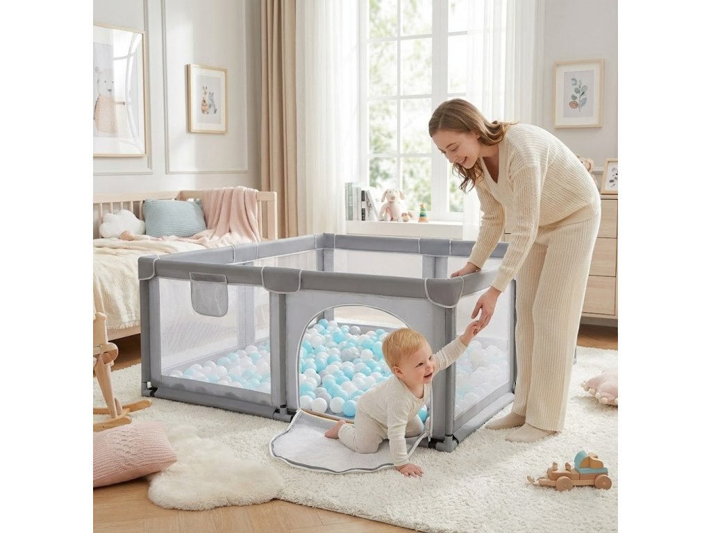 - Měkké lemování na trubkách: Ohrádka má kovové trubky s měkkými pěnami aplikovanými na horní části. Tyto dodatečné bezpečnostní prvky chrání dítě před náhodným nárazem do kovových prvků pro větší pohodlí a bezpečnost při hraní.