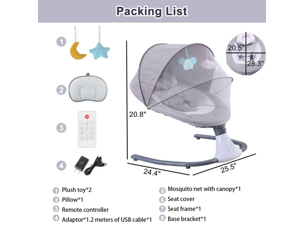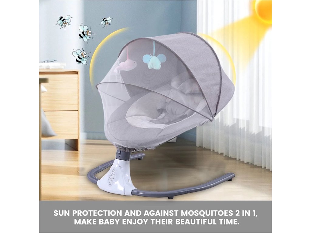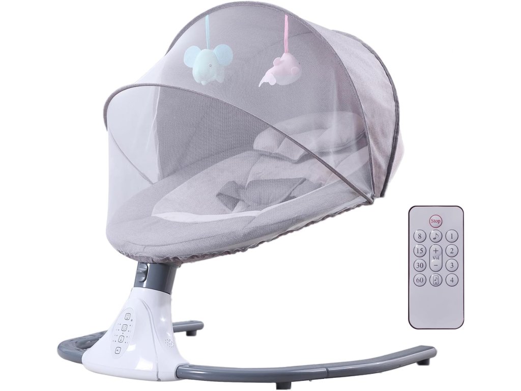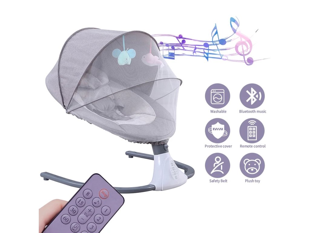 Díky připojení Bluetooth pro přehrávání hudby můžete z telefonu přehrávat pohádky. Dálkové ovládání vám pomůže ovládat dětskou houpačku, což vám umožní mít svůj vlastní prostor a čas. Se 4 funkcemi časování můžete nastavit čas libovolně na 8-15-30-60 minut, čímž efektivně šetříte váš čas a energii.