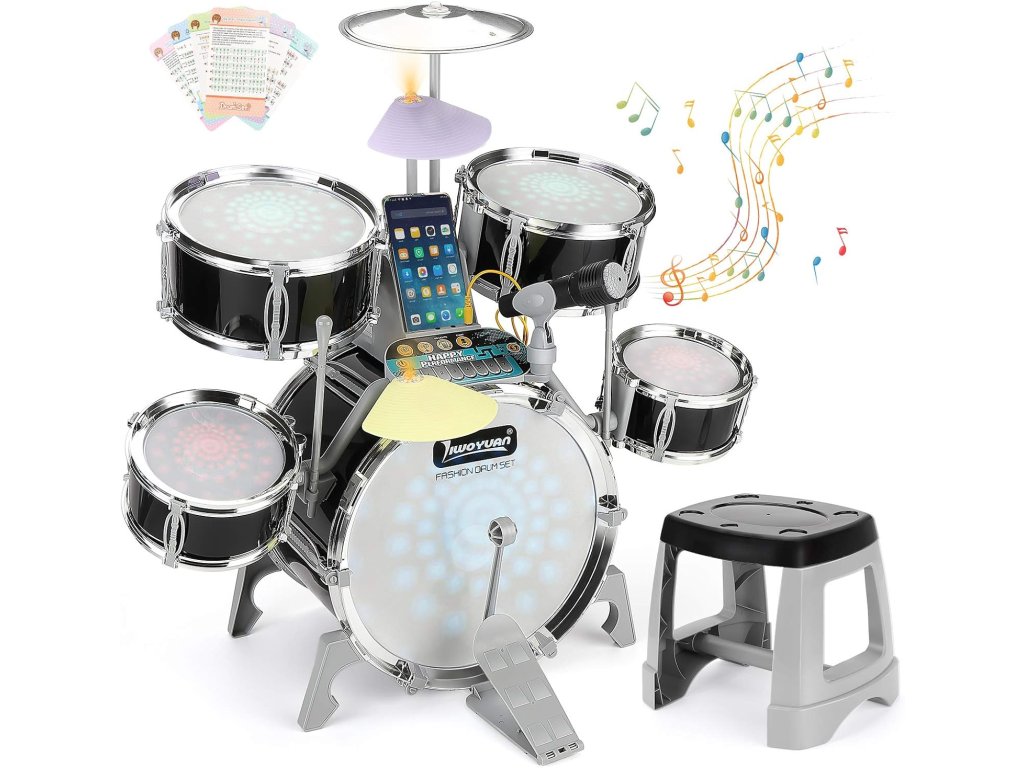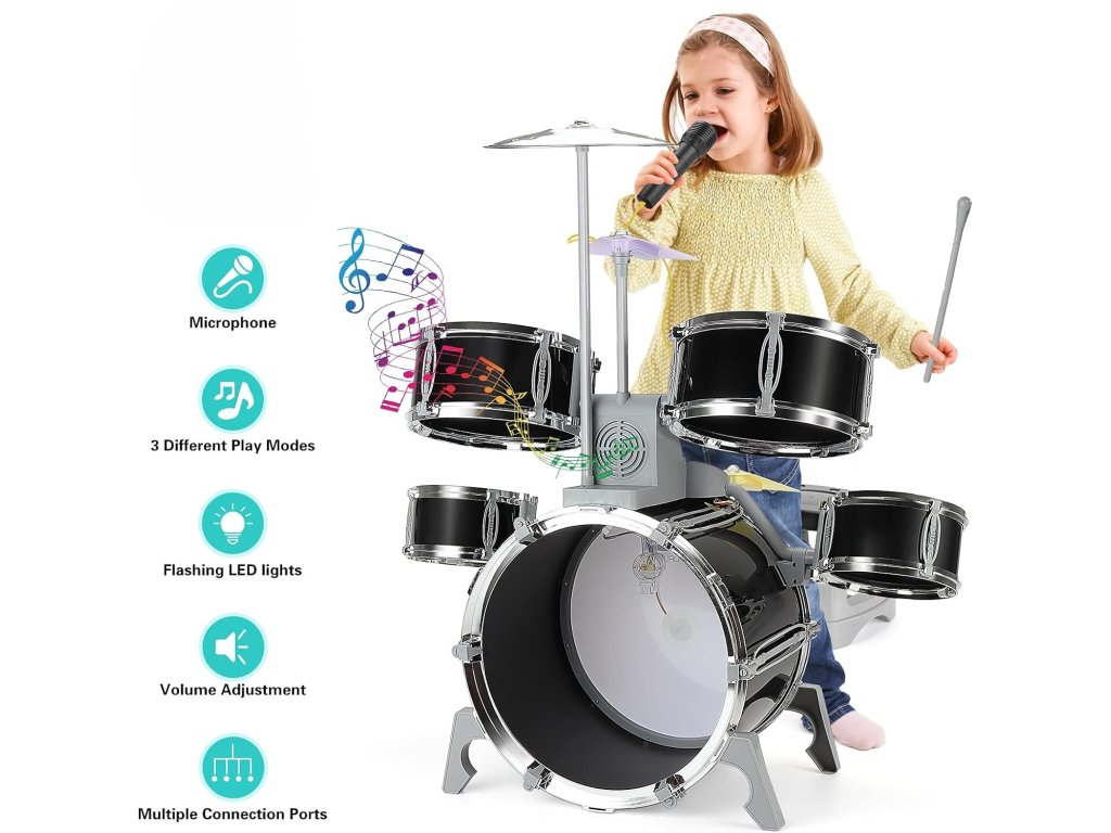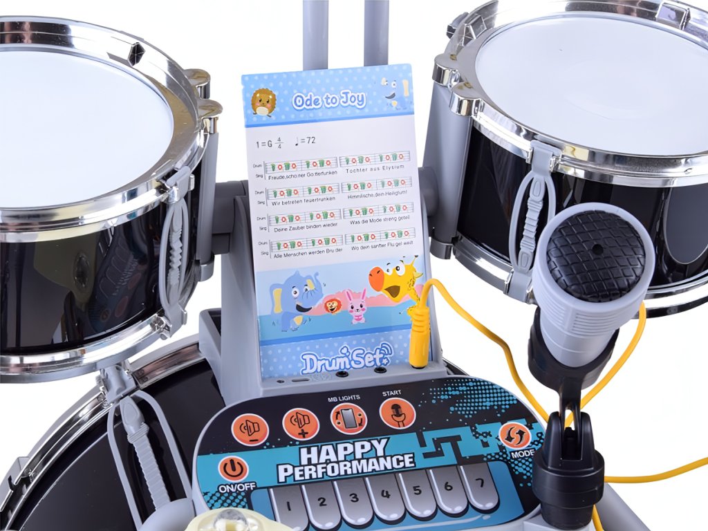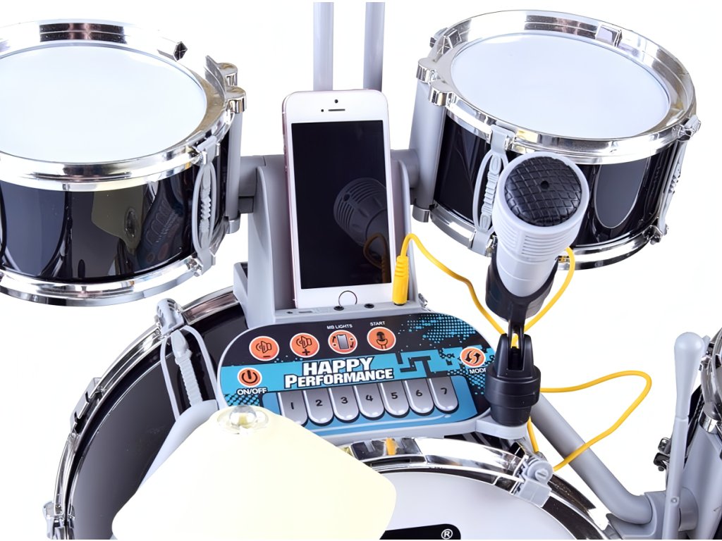 Multifunkční velké bubny s profesionálním zvukem a osvětlenými bubny je hračka pro děti od 3 let. Bicí mají 5 bicích, 2 elektronické (plastové) a jedny kovové činely, ovládací panel, mikrofon, 2 paličky a 6 karet s notami pro naučení hry. Součástí setu je i pohodlný taburet. Tato senzační bicí souprava je napájena 3 x AA bateriemi, ale lze ji nabíjet i přes USB. Bubny mají zvukové a světelné efekty, viditelné při úderech paličkami do bubnů a činelů. V režimu připojení buben-telefon se objeví pulzující rytmy osvětlení bubnu a činelu, takže se vaše dítě naučí hrát na bubny jejich napodobováním. Díky hudebnímu panelu můžete k bicím připojit telefon nebo sluchátka a přidat hudbu na pozadí.