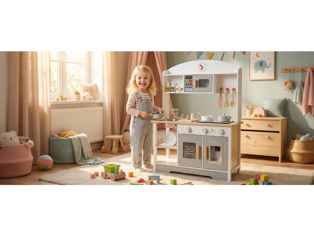 Nabídka zahrnuje velmi široký výběr – od hracích podložek pro miminka, dětské kuchyňky, zahradní či sportovní produkty pro děti přes suché bazény s míčky až po interaktivní hračky a další doplňky pro různé věkové kategorie. Produkty jsou často koncipovány tak, aby dětem přinášely nejen zábavu, ale i potřebný rozvoj.
