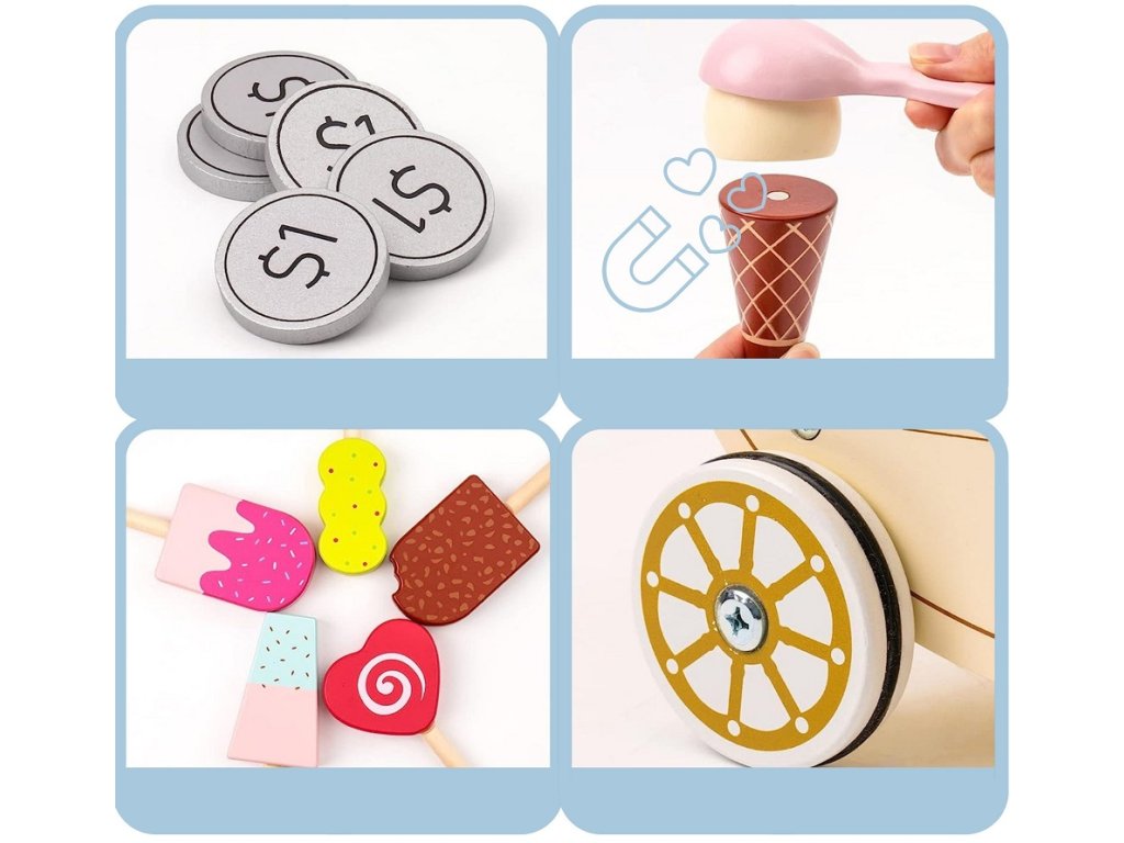 Sada obsahuje zmrzlinu na špejli, oplatky, barevné kopečky, lžičku na zmrzlinu, jídelní lístek a dřevěné mince, které vám pomohou dokončit sladký nákup. Hračka má 6 otvorů pro zmrzlinu a 3 prohlubně pro oplatky. Vozík lze snadno přemisťovat a kolečka jsou bezpečná pro podlahu. Celá sada je vyrobena v krásných pastelových barvách s důrazem na detail.
