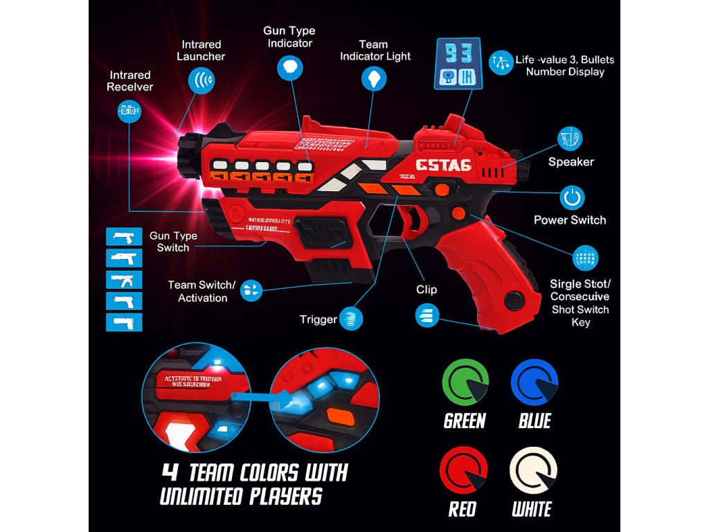 Pistole fungují na infračerveném světle – infračervené vyzařování použité v této soupravě je pro dítě bezpečné a nezpůsobuje poškození zraku. Každá zbraň má počítadlo životů. Po každém přesném zásahu soupeře jeho zbraň zapípá a zavibruje. Vibrace a zvuky střelby poskytnou úžasný zážitek pro každého uživatele. Když dojdou „životy“, světla na zbrani zhasnou.