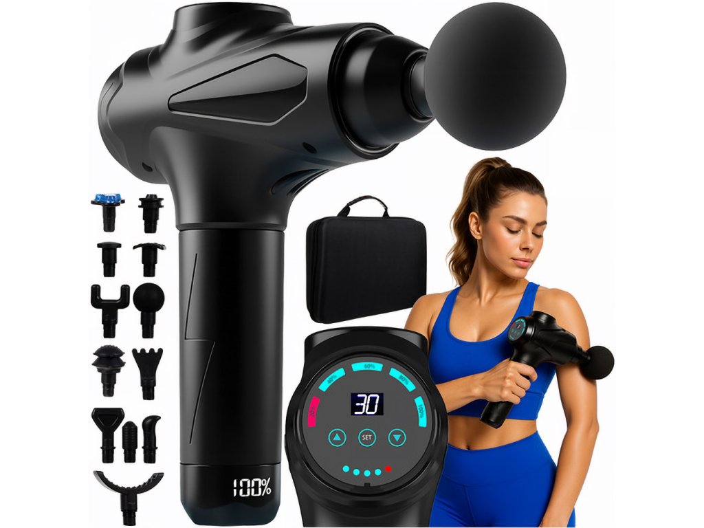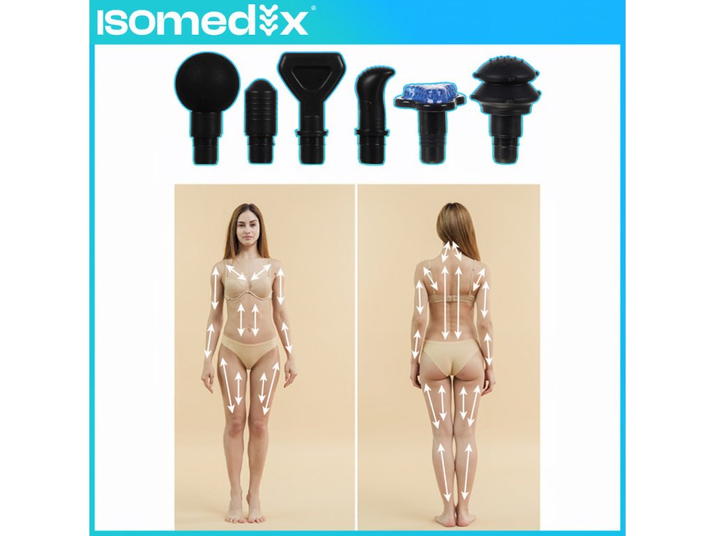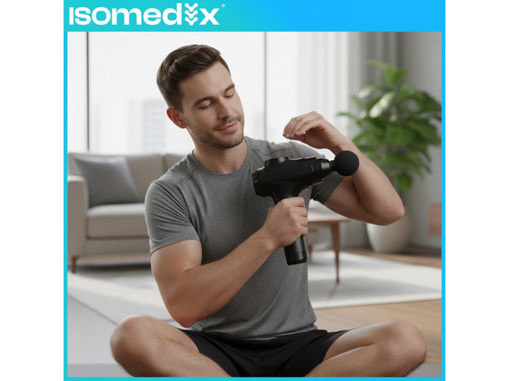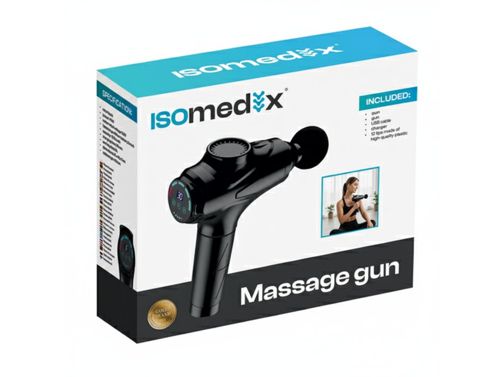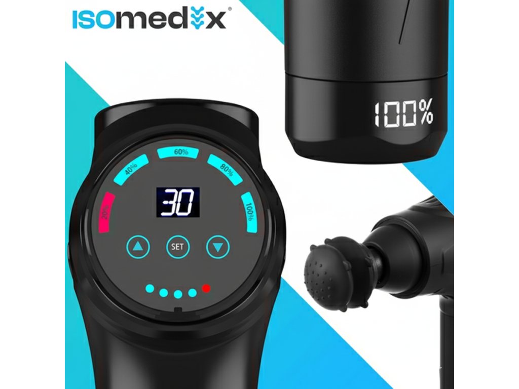 Masážní pistole ISOMEDIX – 30 úrovní intenzity, 12 vyměnitelných trysek – síla, relax a pohodlí ve vašich rukou!