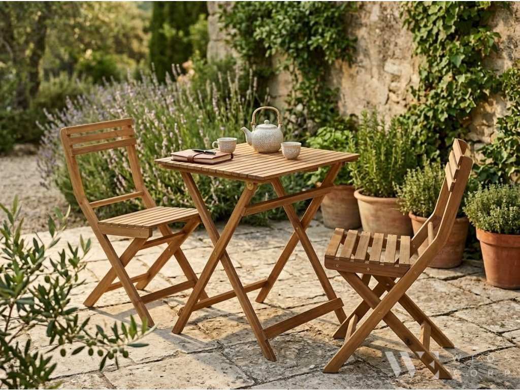 MultiGarden Zahradní nábytek z akáciového dřeva – stůl a 2 židle splňuje všechny normy EU.