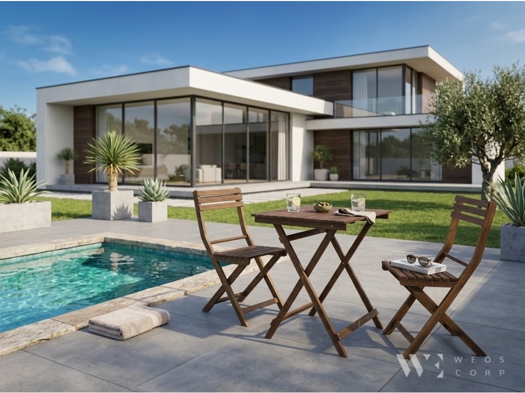 Tato elegantní sada zahradního nábytku se skládá z kulatého stolu a dvou skládacích židlí vyrobených z masivního akáciového dřeva. Akáciové dřevo je známé svou trvanlivostí a odolností vůči povětrnostním vlivům, což z něj činí ideální materiál pro venkovní nábytek.