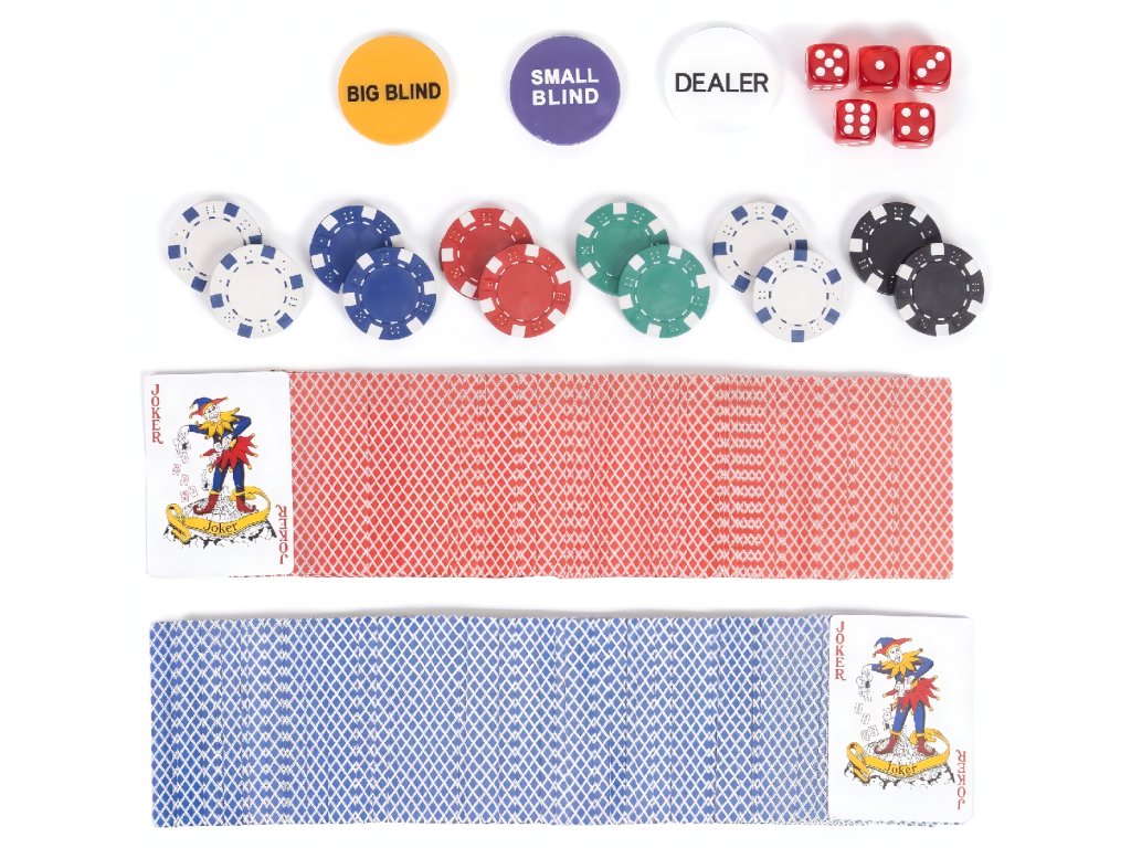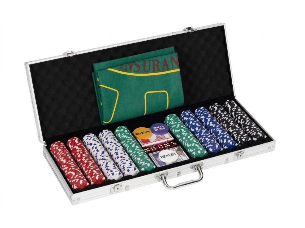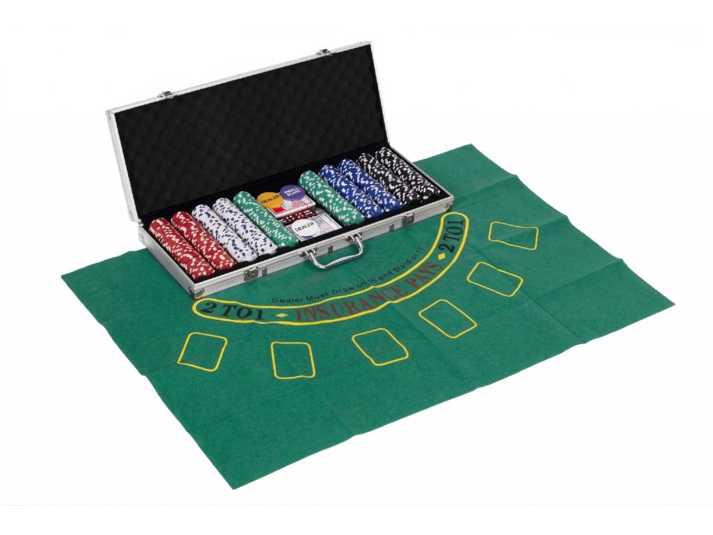 Multistore Sada na blackjack poker s 500 žetony, 2 balíčky karet, kostkami, hrací podložkou a přepravním pouzdrem splňuje všechny normy EU.