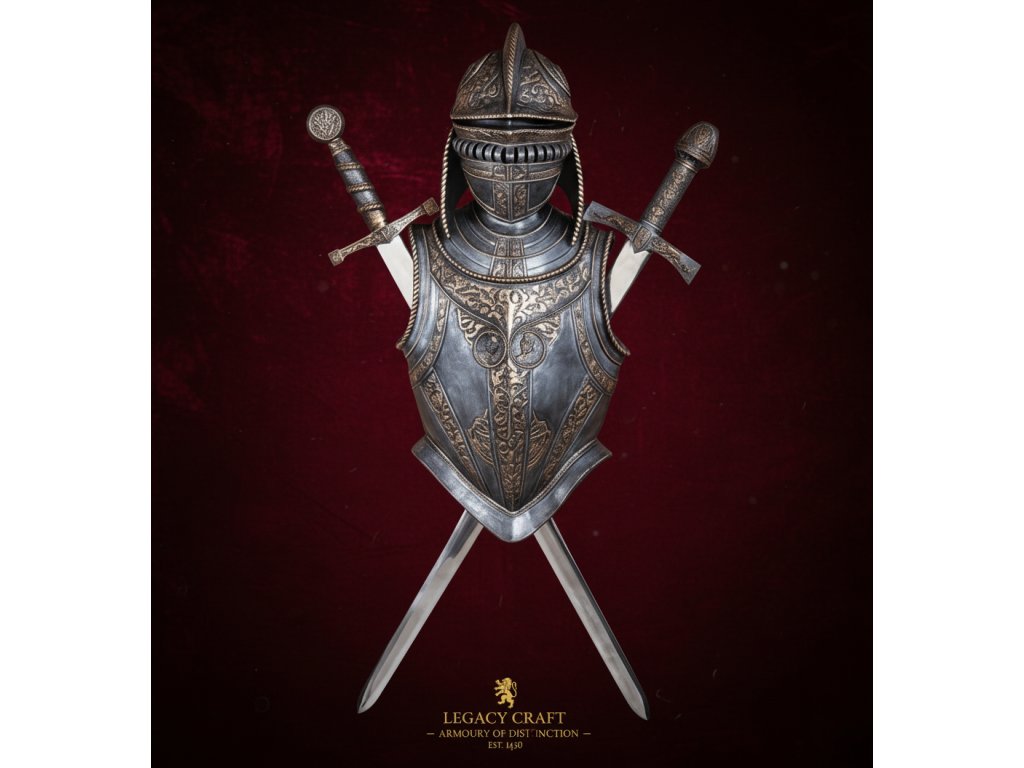 Milovníkům historické výzbroje přinášíme působivý set: bitevní štít v životní velikosti, helmici a dvojici dekorativních mečů. Inspirováno šlechtickými sídly 16. století, kde brnění symbolizovalo prestiž a moc. Každý prvek je ručně kolorován ve stříbrném tónu a detailně zpracován. Meče (délka cca 1,1 m) mají kovové čepele a zdobené jílce – ideální doplněk pro interiér s charakterem.
