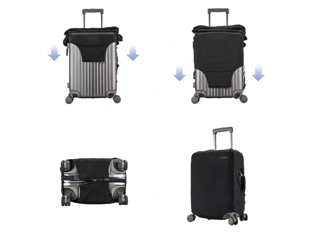 Praktičnost - potah se velmi snadno nasazuje i sundává díky pružnému materiálu a zipům. Překryv má speciální otvory pro kolečka, madla kufru a výsuvná teleskopická rukojeť , která vám umožní volně používat kufr bez nutnosti sundávat kryt. Přídavný gumový pásek s přezkou zajišťuje lepší uchycení a zabraňuje sklouznutí potahu.